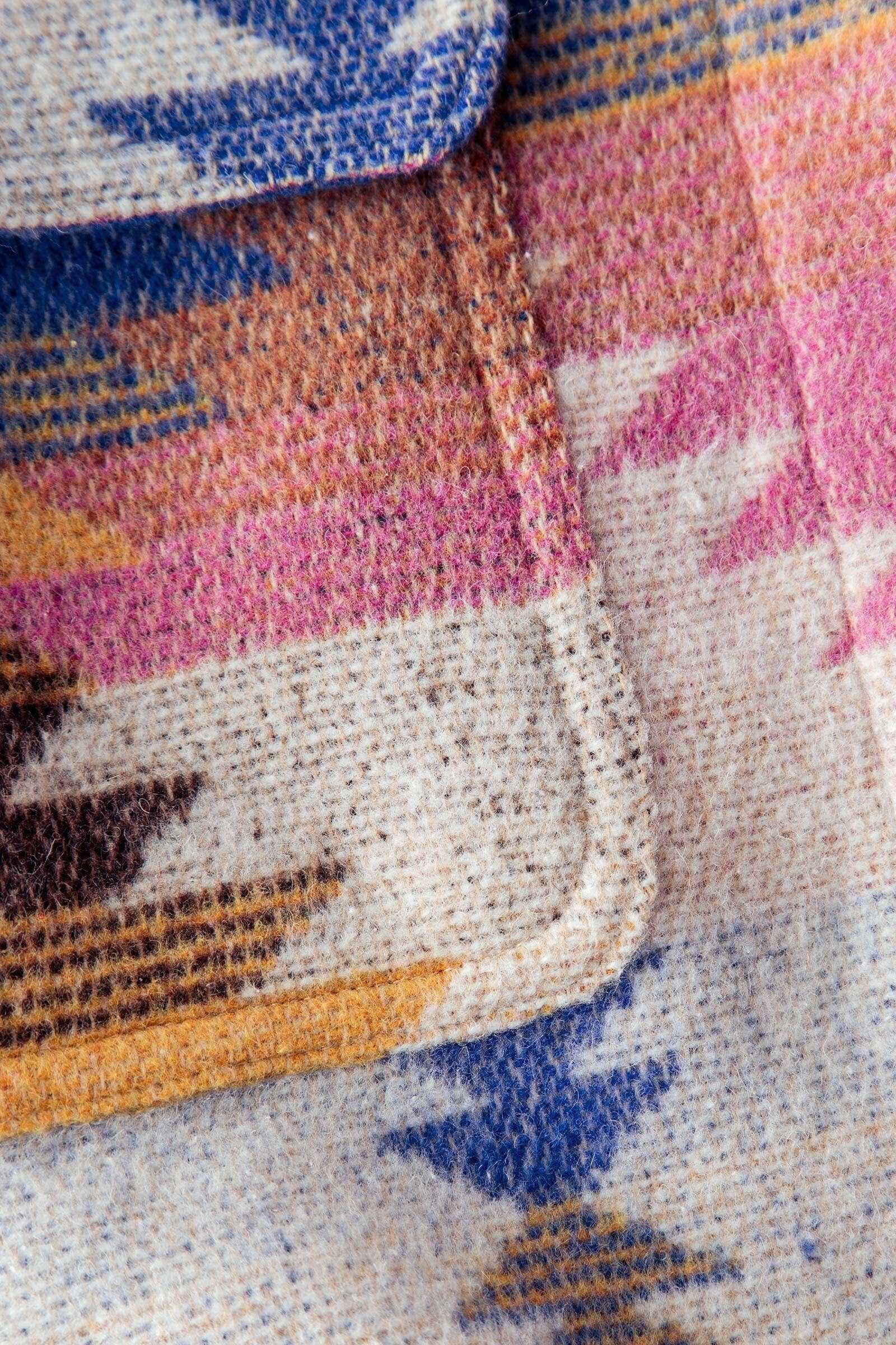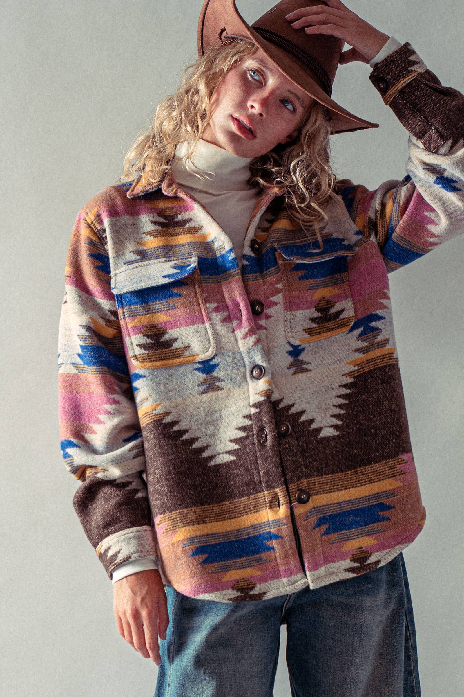 Add a touch of Western charm to your collection with our Aztec-inspired jacket, designed for cozy comfort and standout style. Crafted in a warm woven fabric with a soft brushed texture, it features a bold Aztec motif in earthy tones accented by vibrant pops of color.