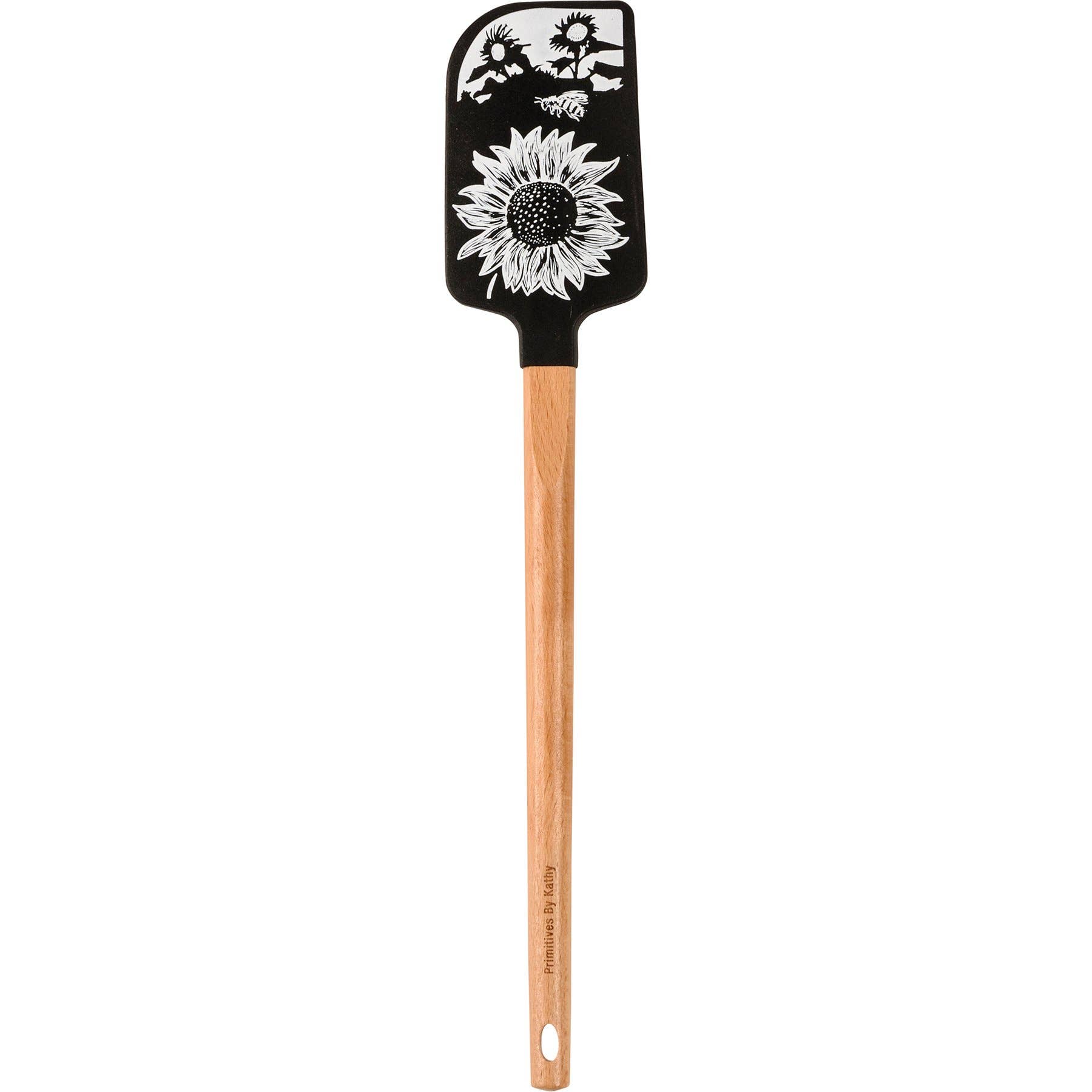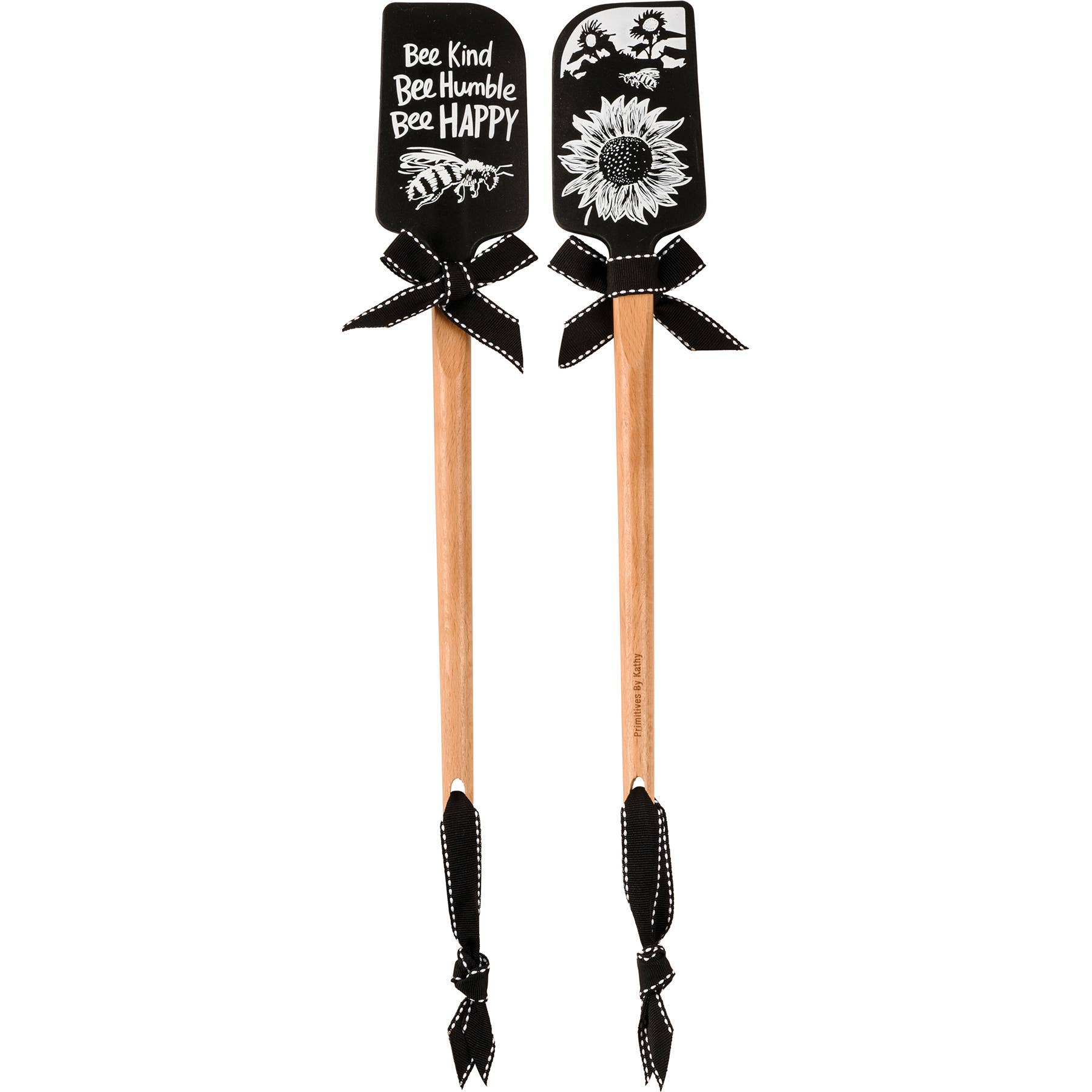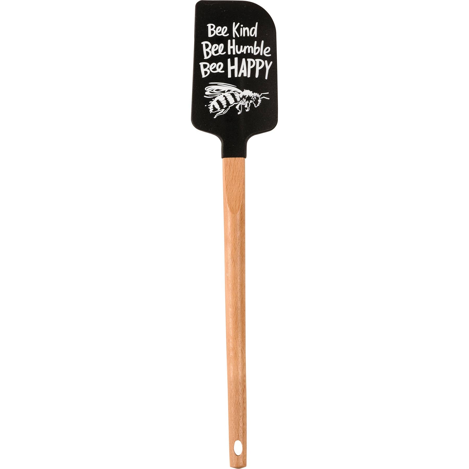 A double-sided silicone spatula featuring bee design with "Bee Kind Bee Humble Bee Happy" sentiment on one side, and bee and sunflower designs on the other side.