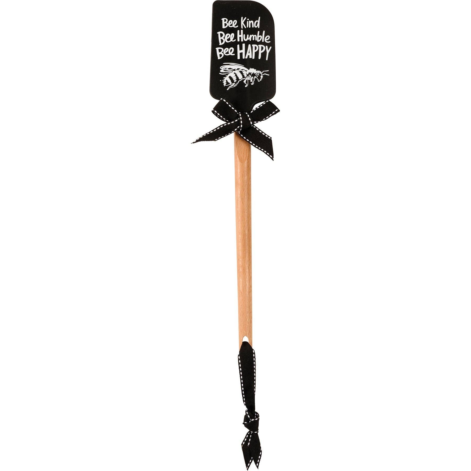 Our Bee Kind Bee Humble Bee Happy spatula features a logo engraved into wooden handle for added interest and a decorative bow and ribbon for hanging.