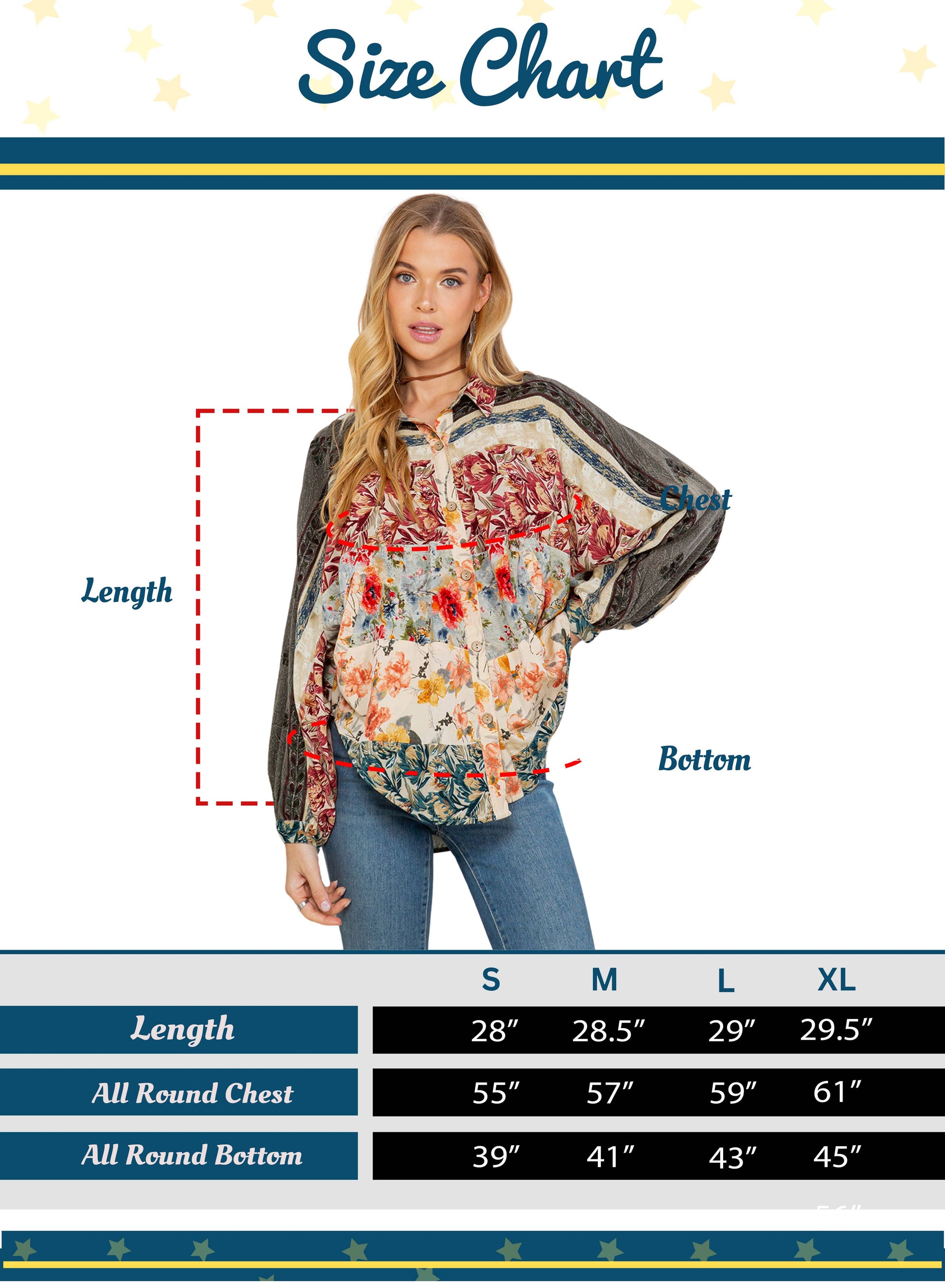 Introducing our Mexican Embroidery Bishop Sleeves Loose Western Top, a fusion of rich rayon overdyed embroidery and vibrant floral prints patchwork.