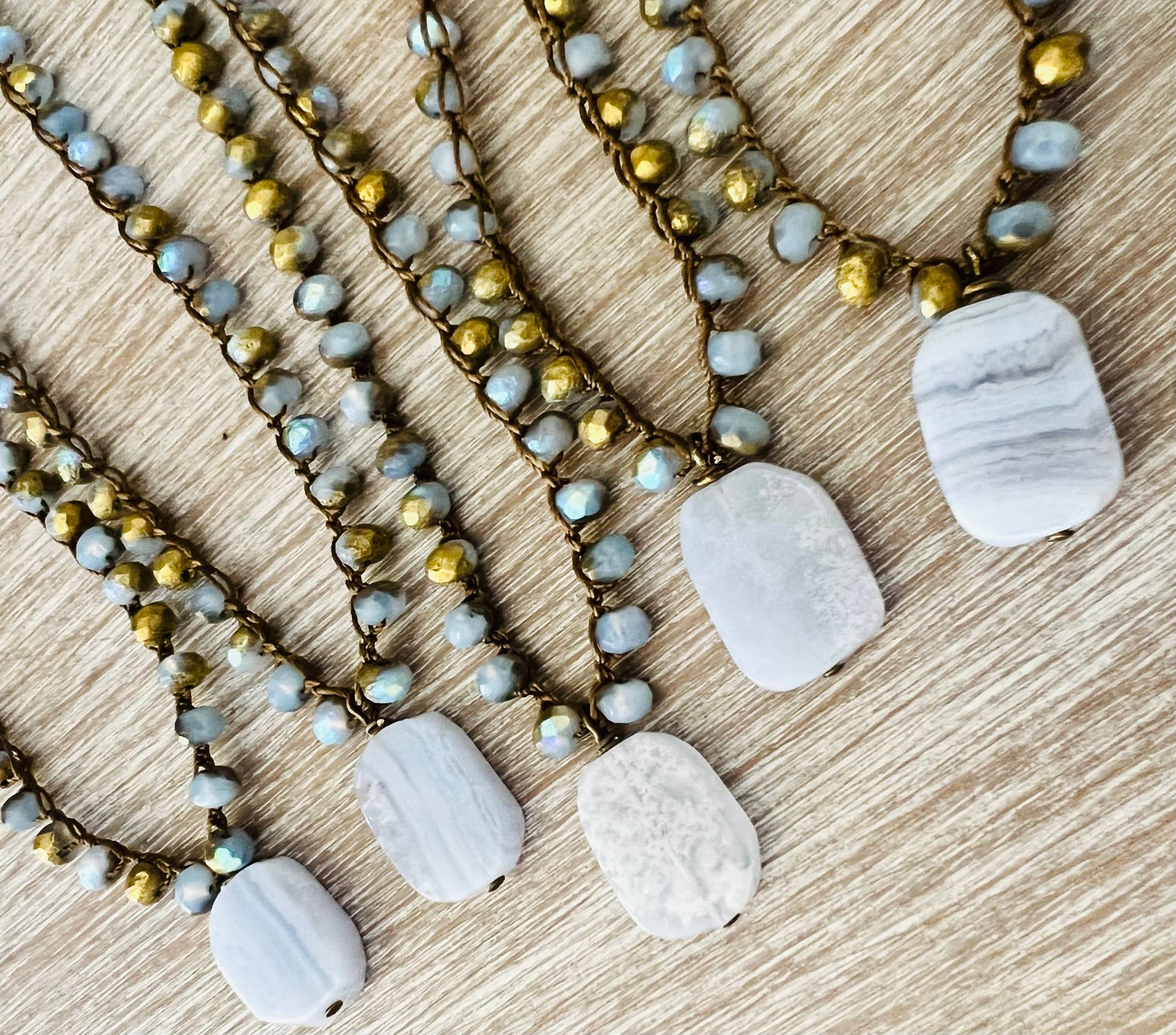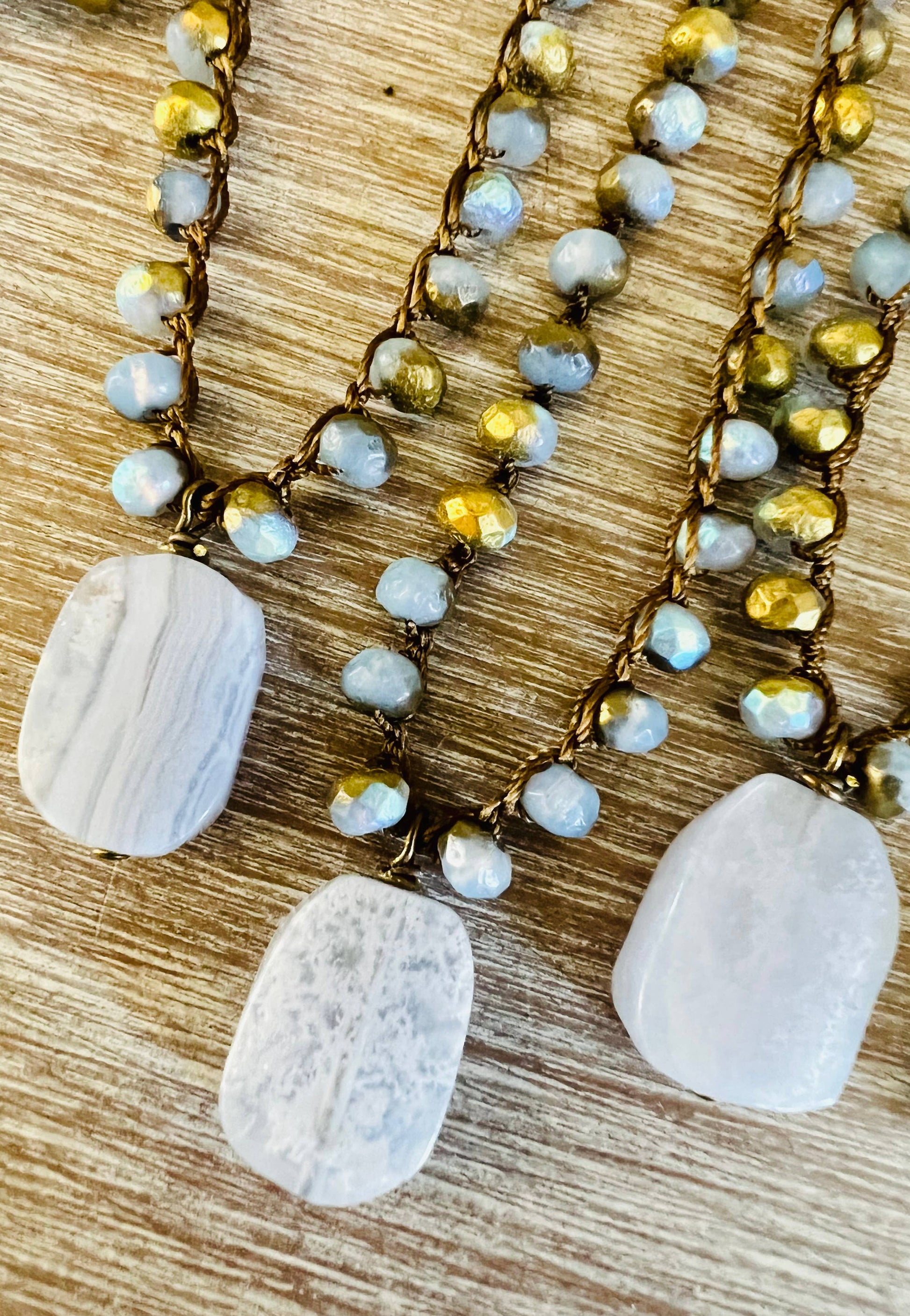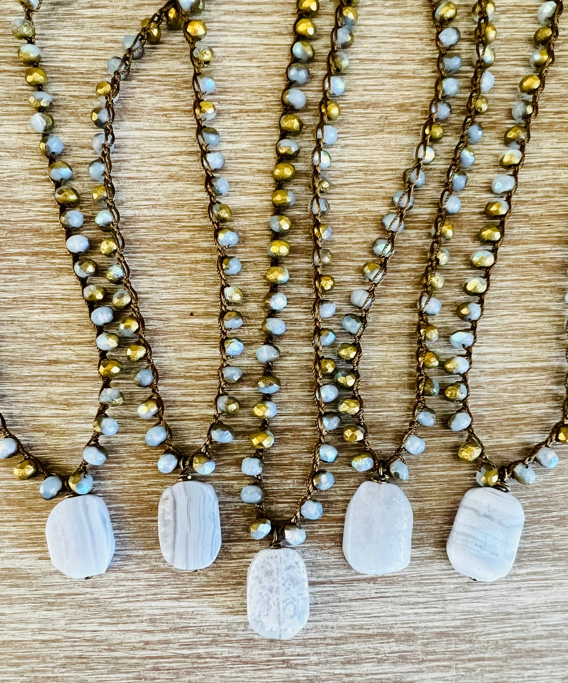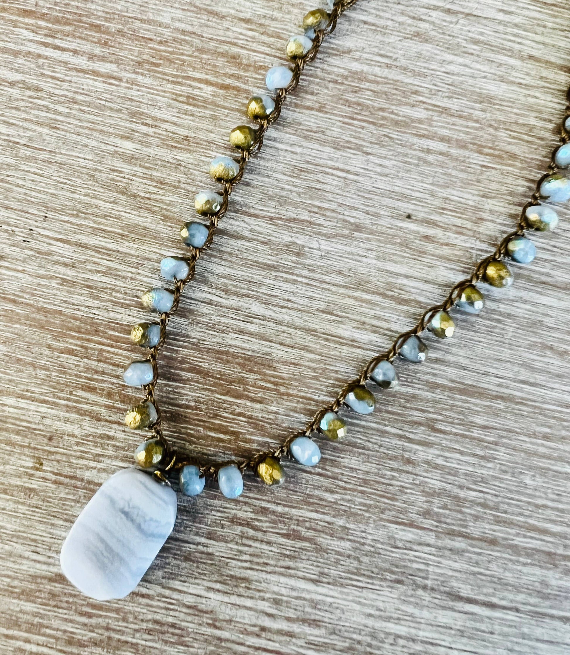 Blue Lace Agate Natural Stone Necklace With Autumn Gold