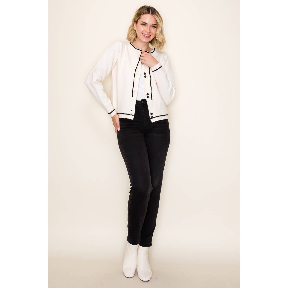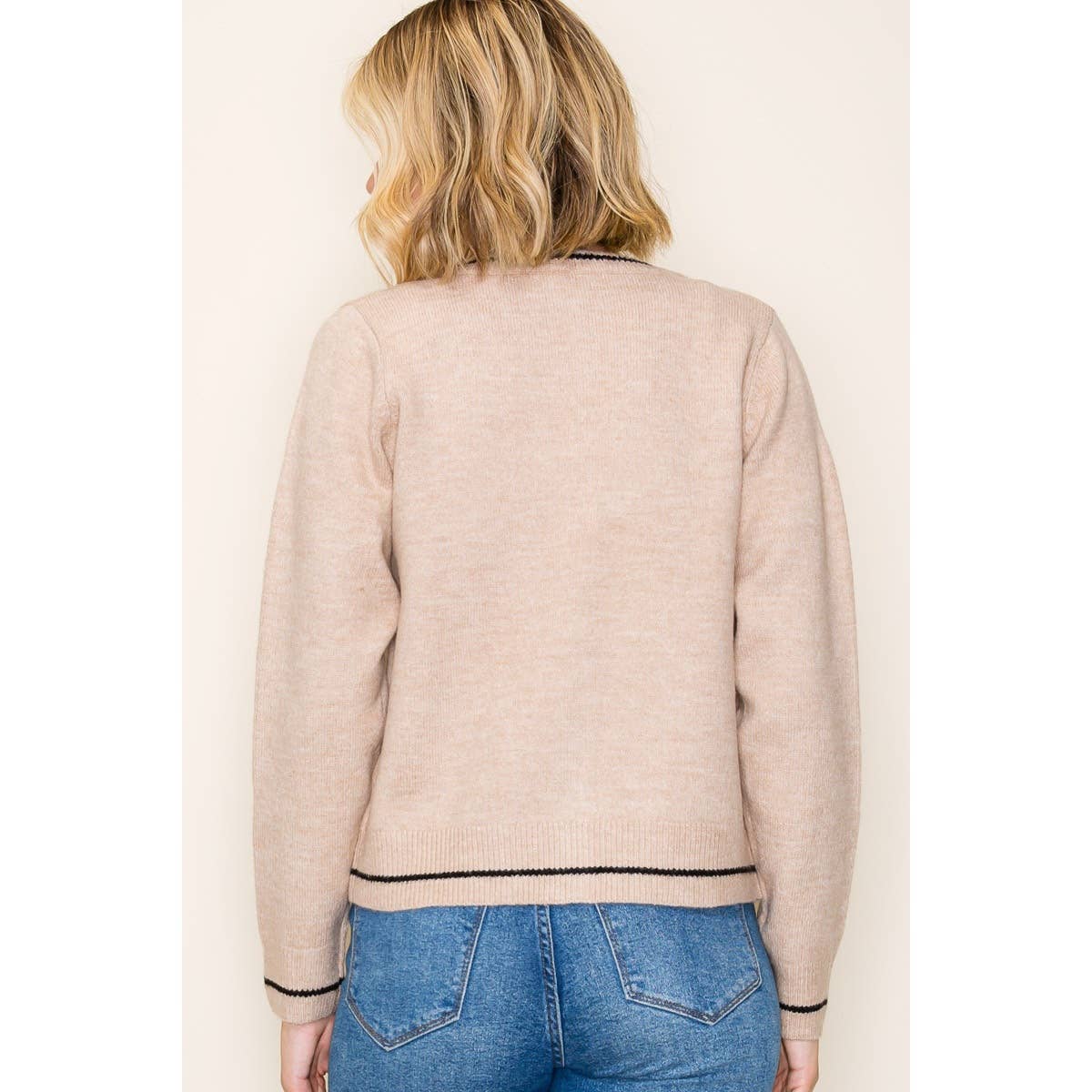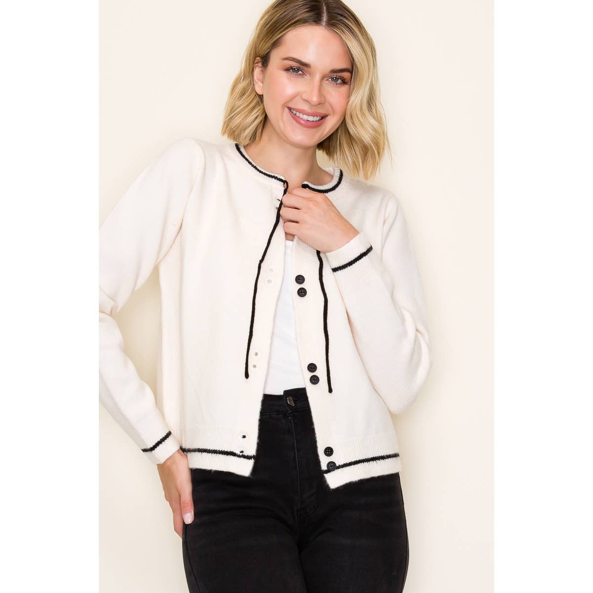 COLOR ACCENTED, BOW TIE NECK, LONG SLEEVE, BUTTON DOWN SWEATER CARDIGAN