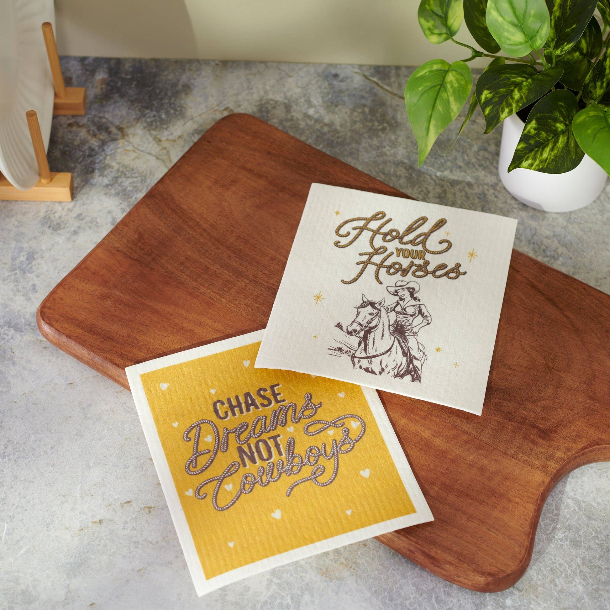 Safe to use on all types of surfaces, eco-friendly Swedish Dishcloths dry quickly and are antibacterial for more hygienic cleaning with reduced waste. This set of 2 Swedish Dishcloths from our Western Collection features fun hand illustrated western inspired sentiments. Western designs include a "Chase Dreams Not Cowboys" sentiment with hearts on one dishcloth and a cowgirl on a horse with a "Hold Your Horses" sentiment on the other dishcloth.