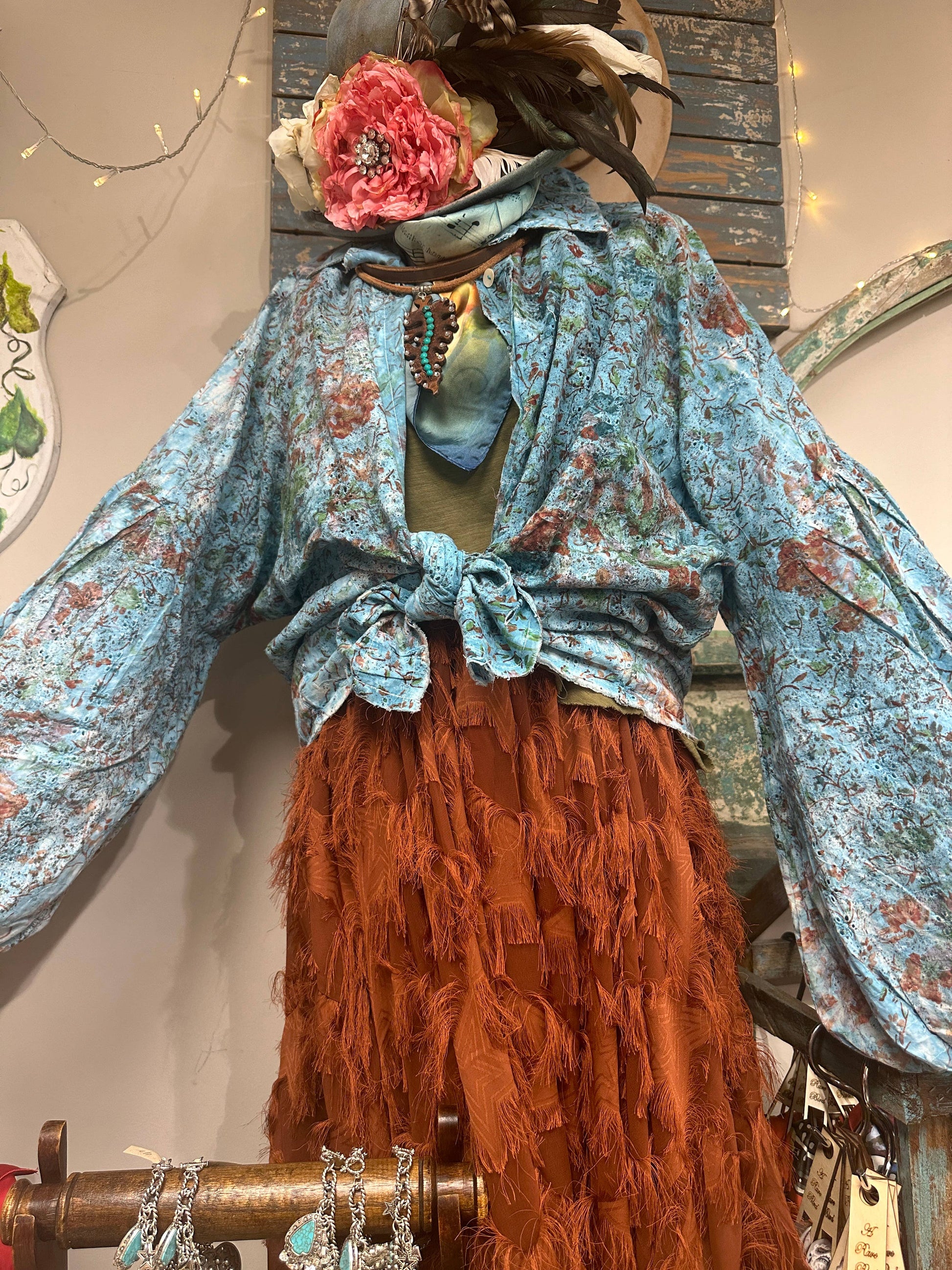 Turquoise distressed eyelet with touches of rust create a fun pallet for this balloon sleeve shirt. Can be buttoned, worn open, or tied in the front.