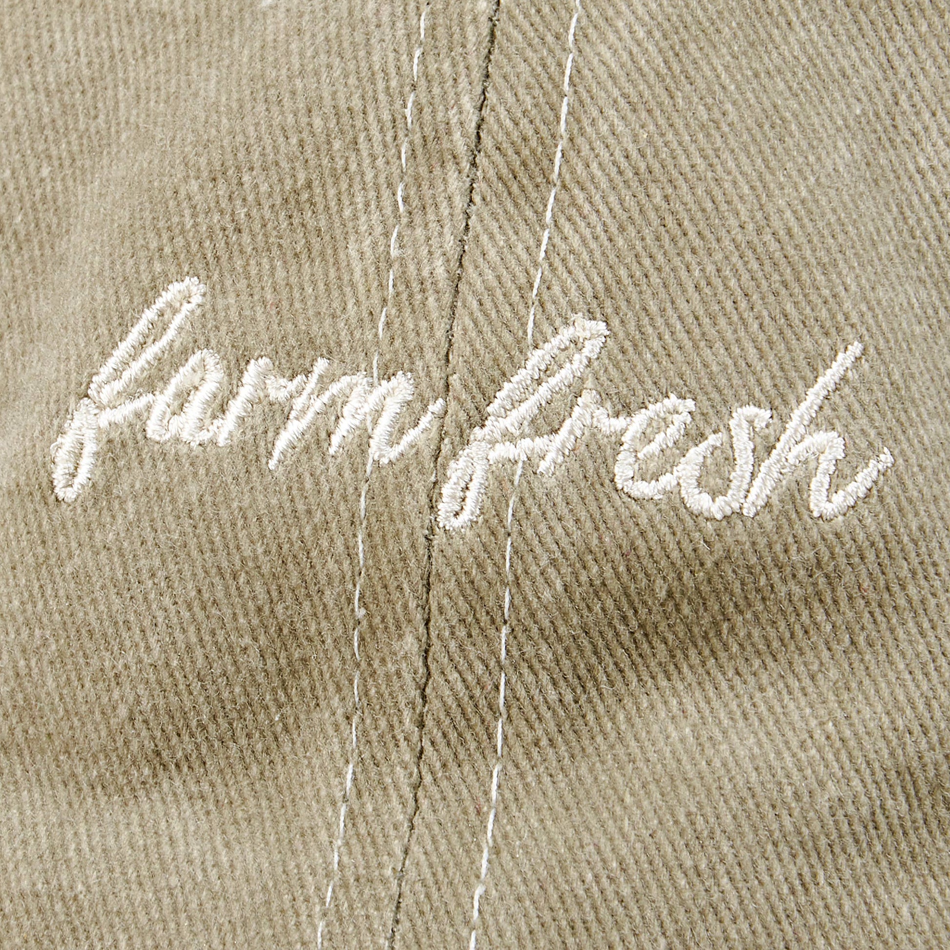 A stonewashed tan baseball cap from our Homestead Collection featuring an embroidered farm inspired sentiment that reads "Farm Fresh." Our Farm Fresh hat is one size fits most with an adjustable buckle closure to create the perfect fit.