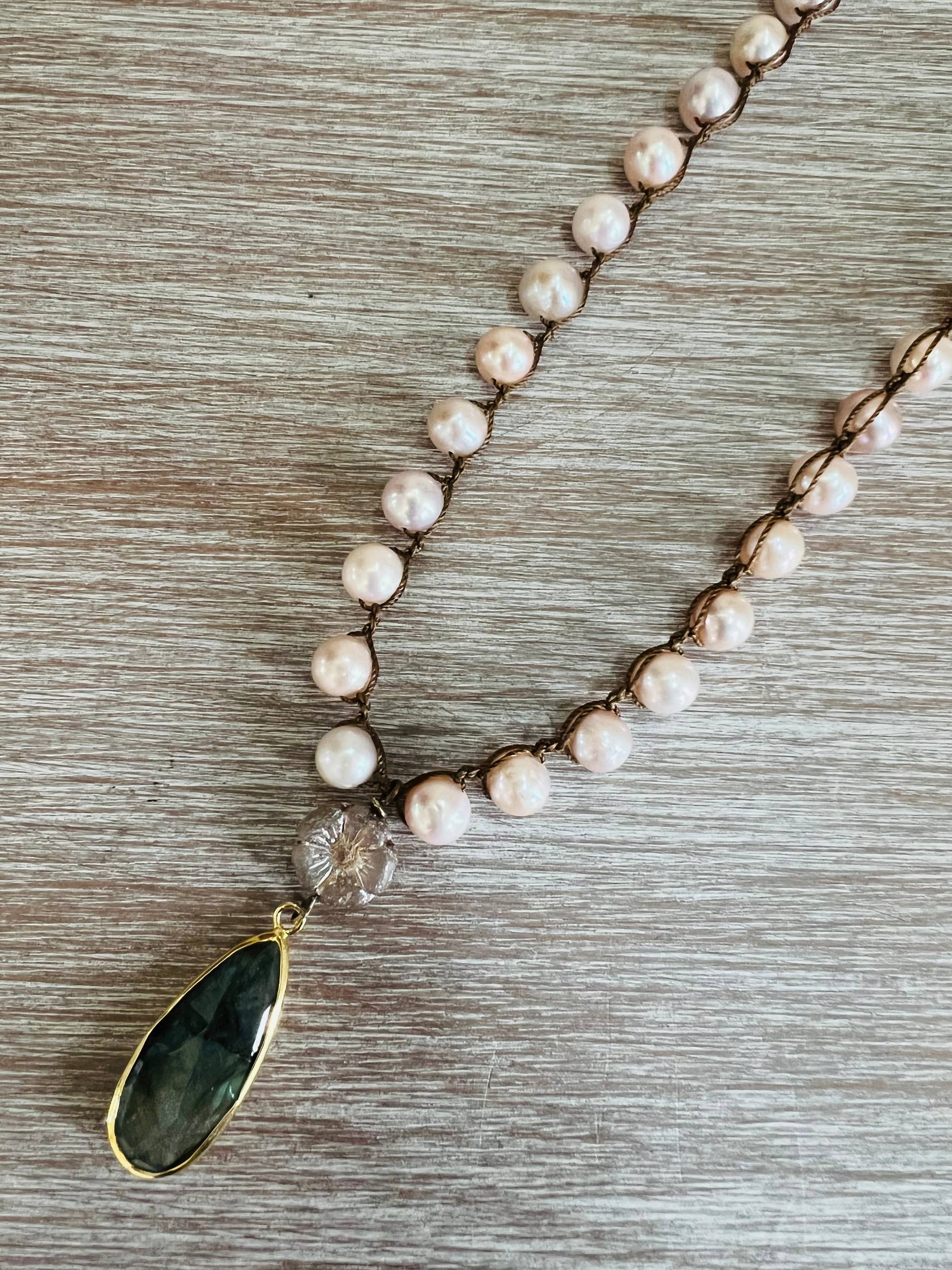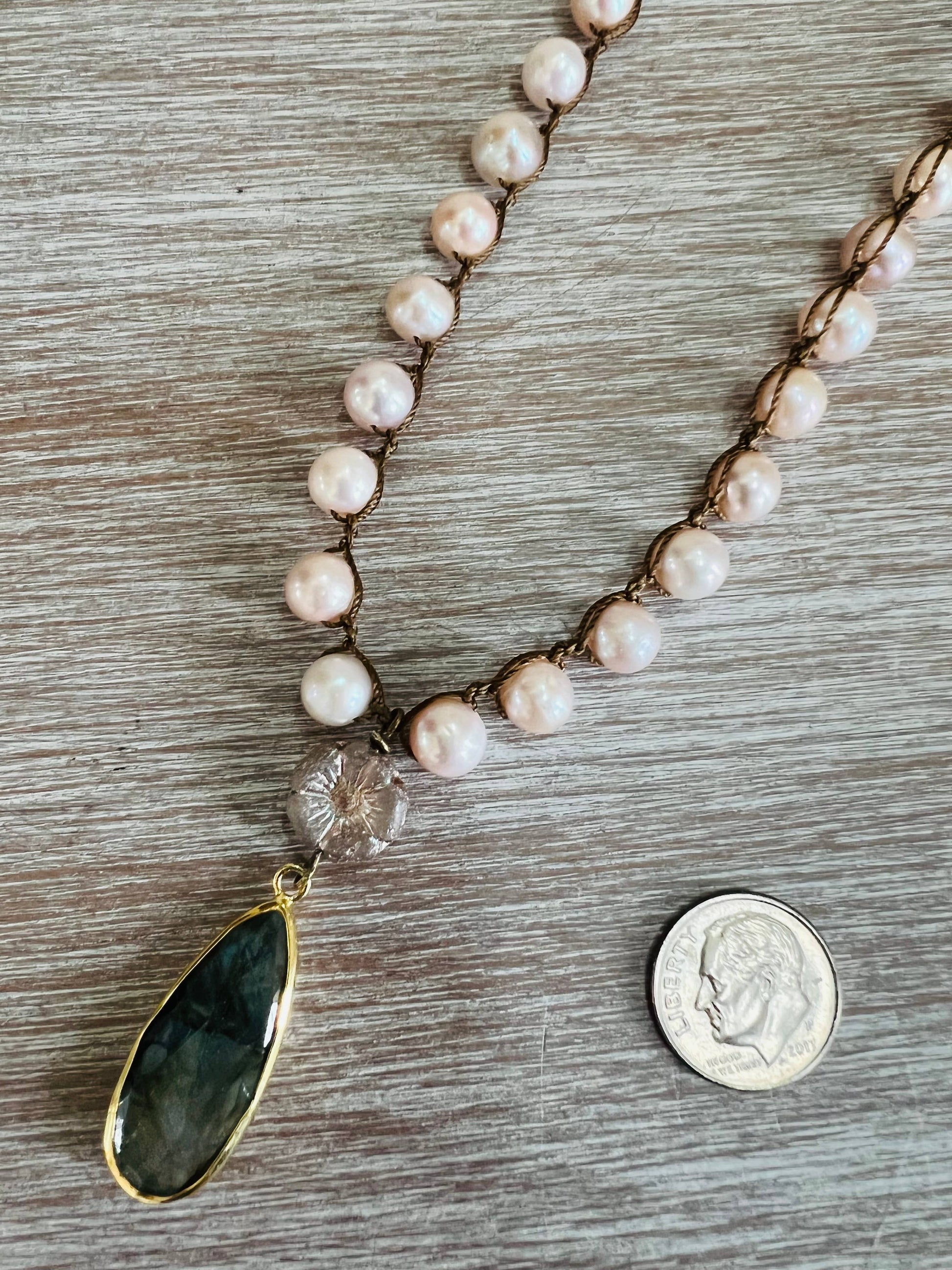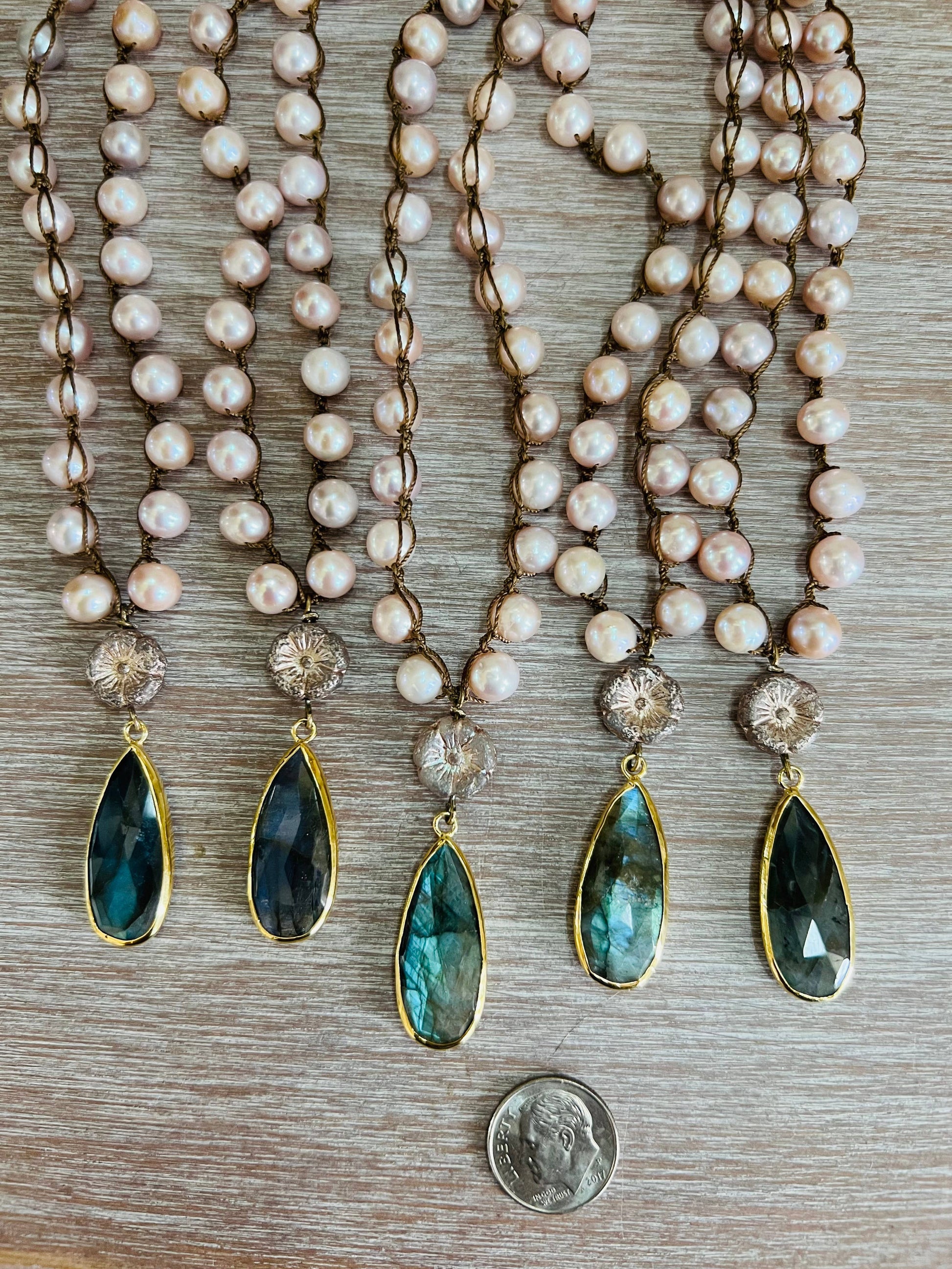 I've paired them with faceted drop of labradorite set in gold plate and have the stone hanging from a frosty pink, European crystal flower.