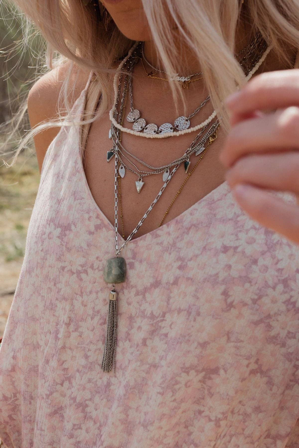 Effortlessly get the boho look with this layered necklace including layers of silver chains at different lengths, cute charms, a stone pendant with a chain tassel attached, and a single clasp. *