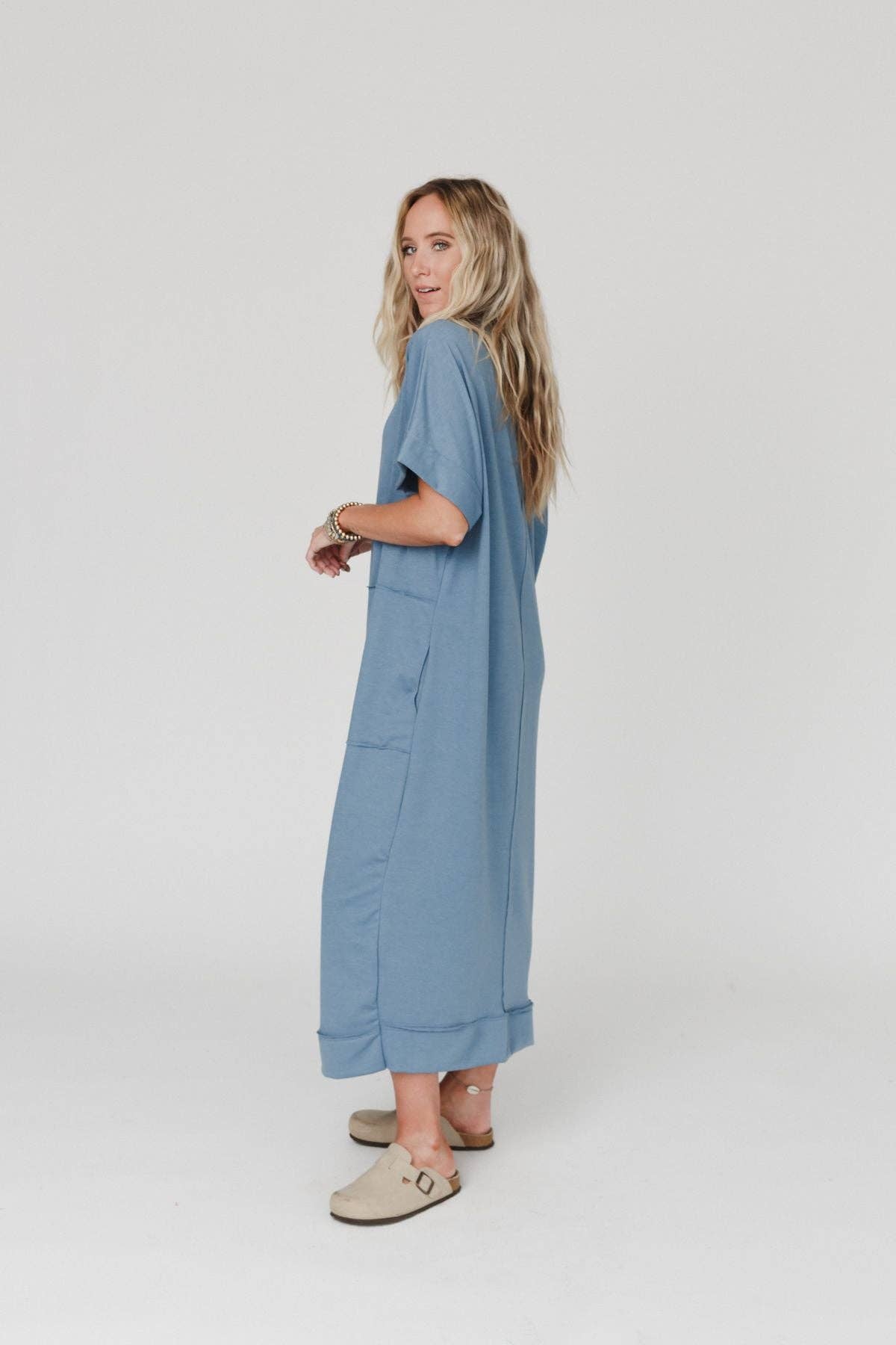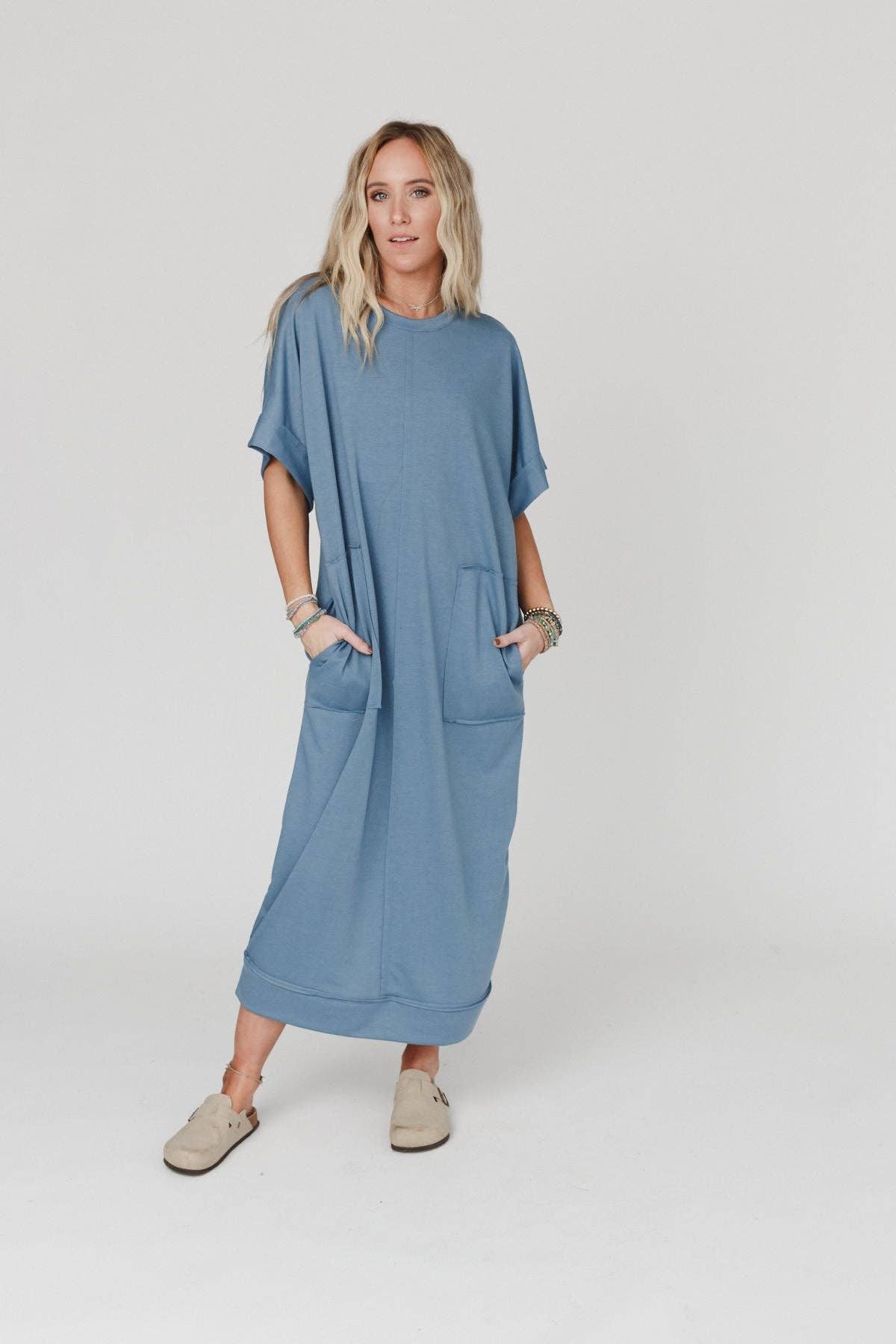 This dress will quickly become your go-to outfit because it features: High-quality, comfy, stretch knit fabric Perfect relaxed and loose silhouette Maxi length Classic crew neckline Flowy short sleeves Front patch pockets Exposed seams for added boho style