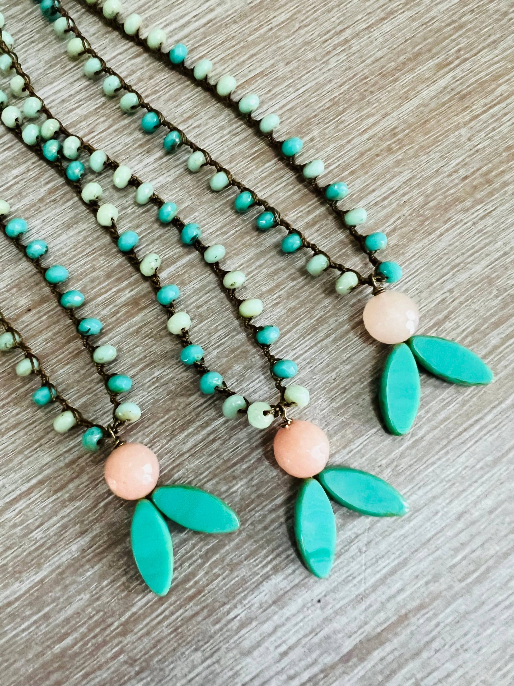 Faceted peach agate stones are complemented by the perfect shade of aqua leaves, and paired with an aqua Czech crystal stand.
