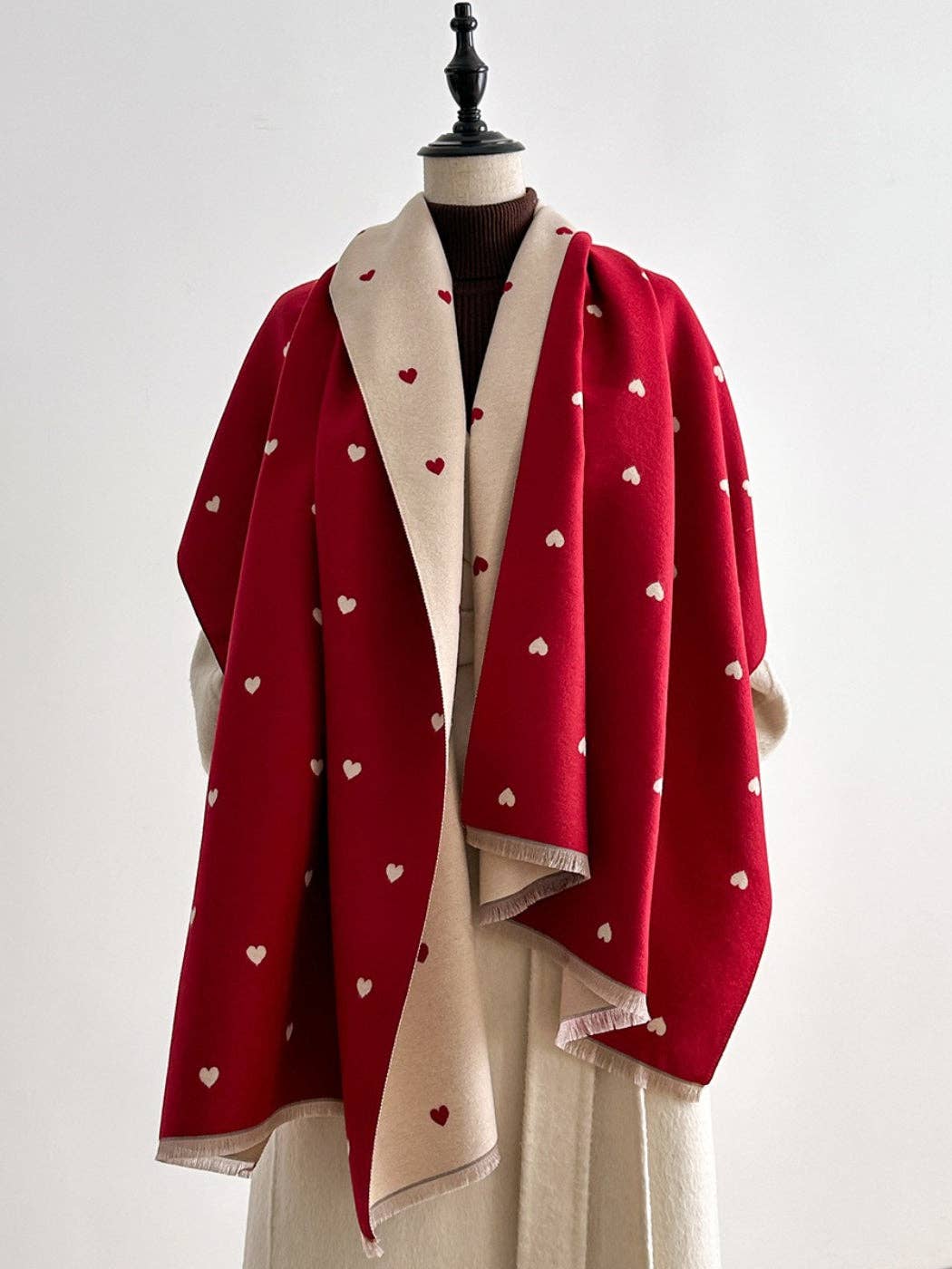 * Double-sided printing with heart patterns on both sides * Delicate fringe detailing on both ends * Versatile styling as scarf or elegant wrap