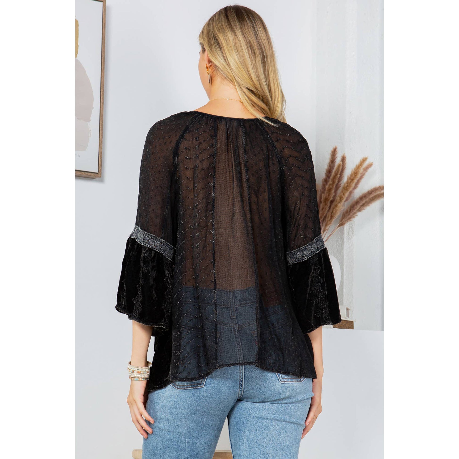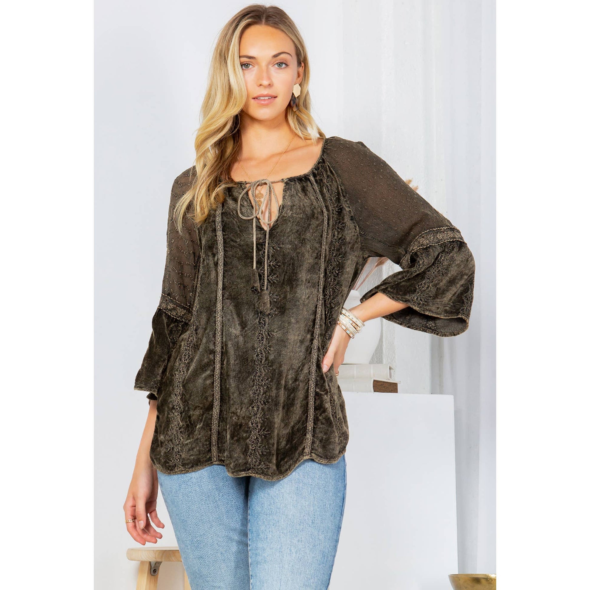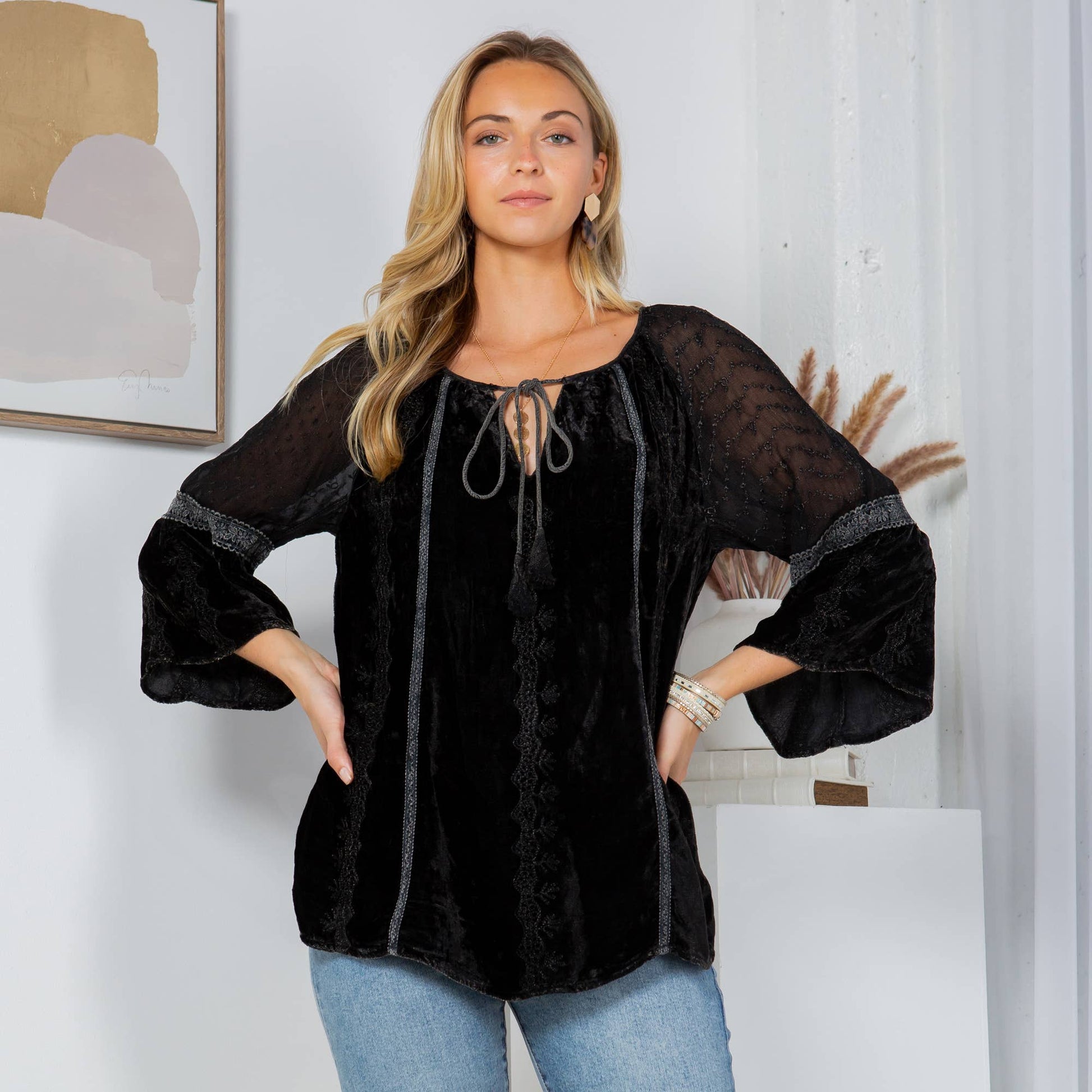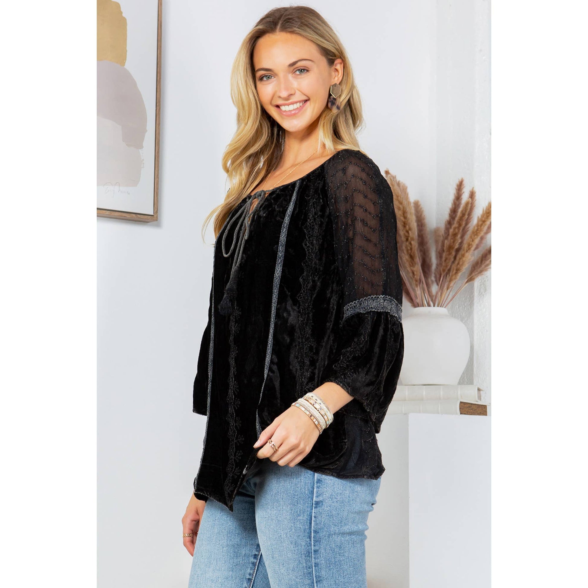 • Peasant-style silhouette offers a flattering and comfortable fit • 3/4 sleeves for a relaxed fit, ideal for layering • Soft velvet fabric ensures comfort and elegance • Versatile piece suitable for both casual and evening wear