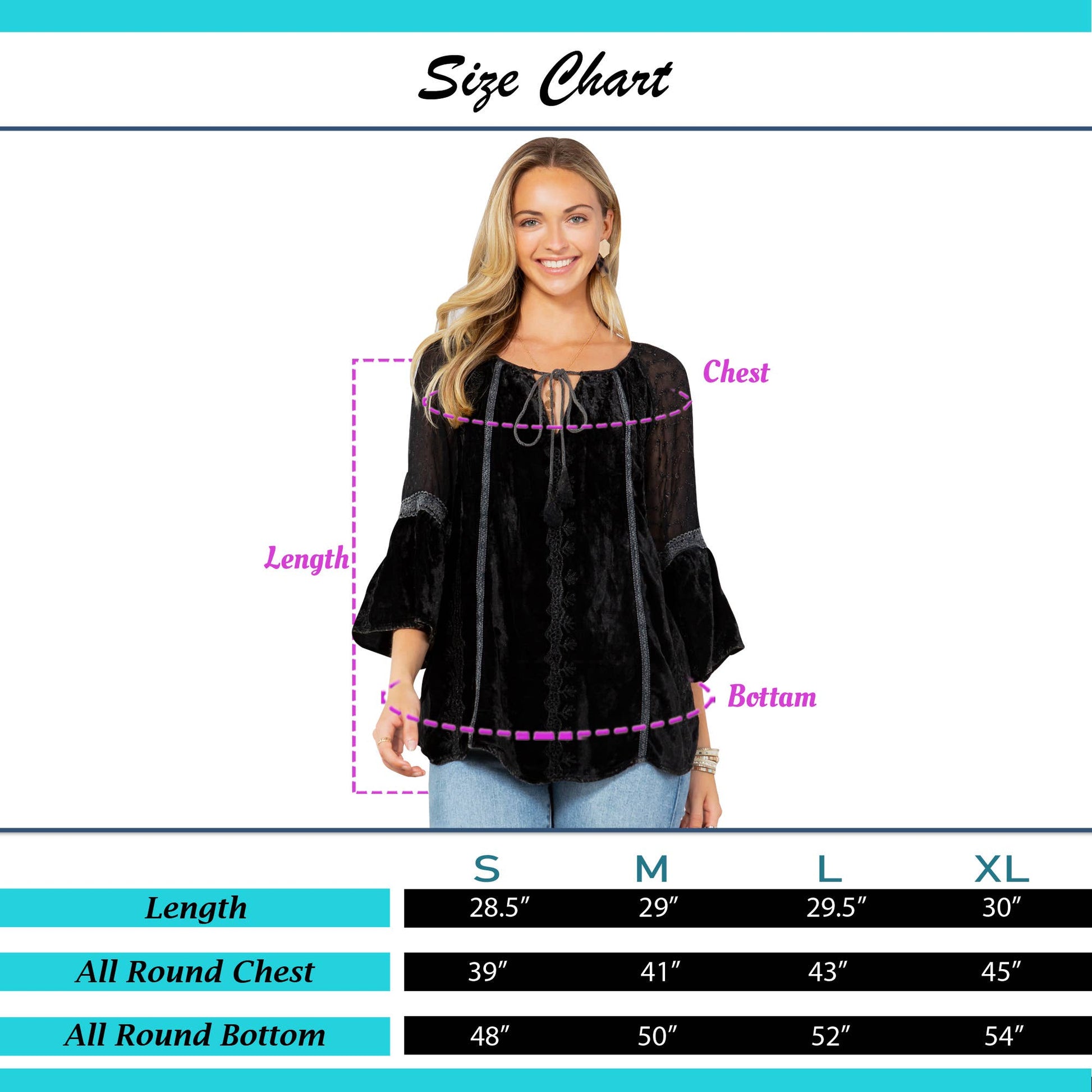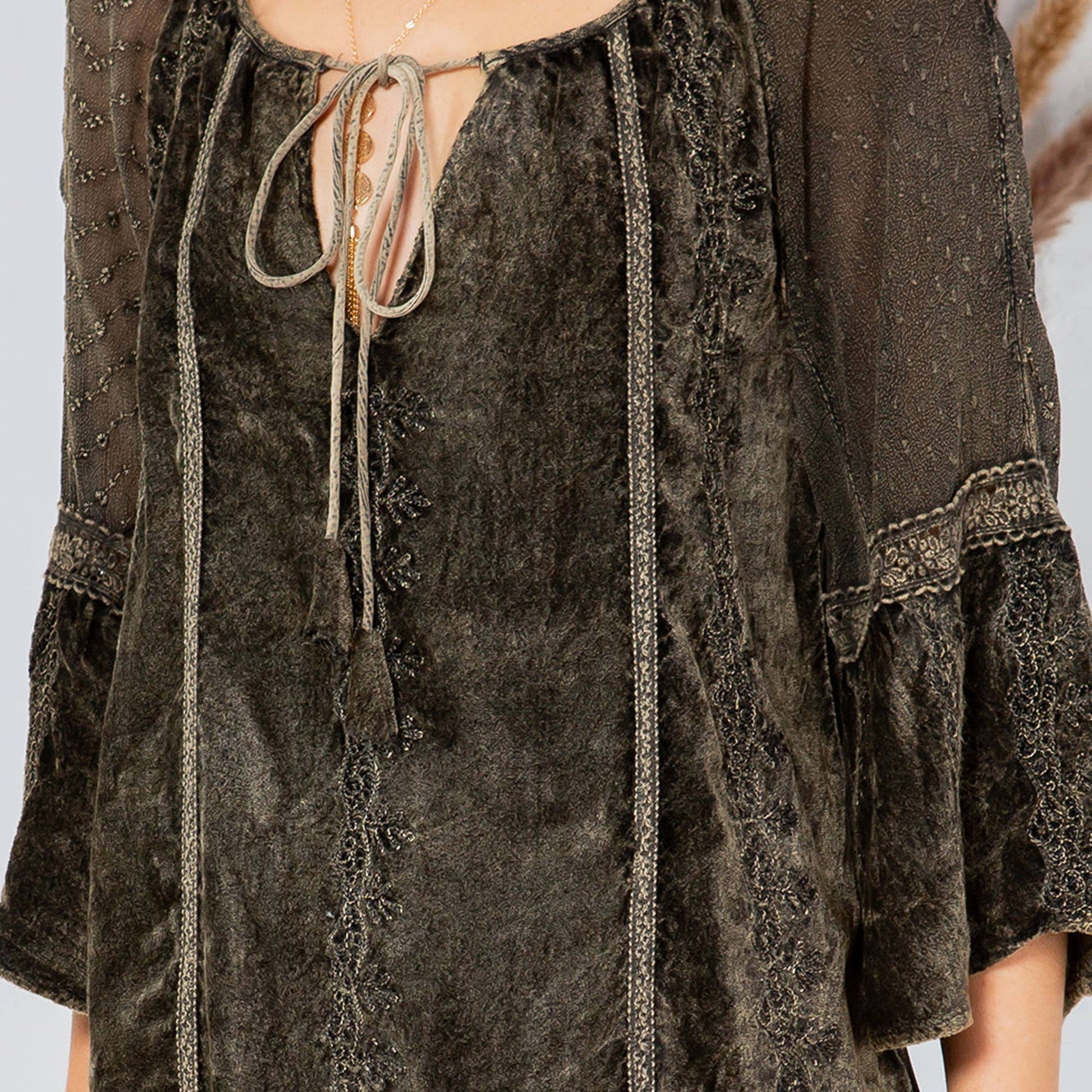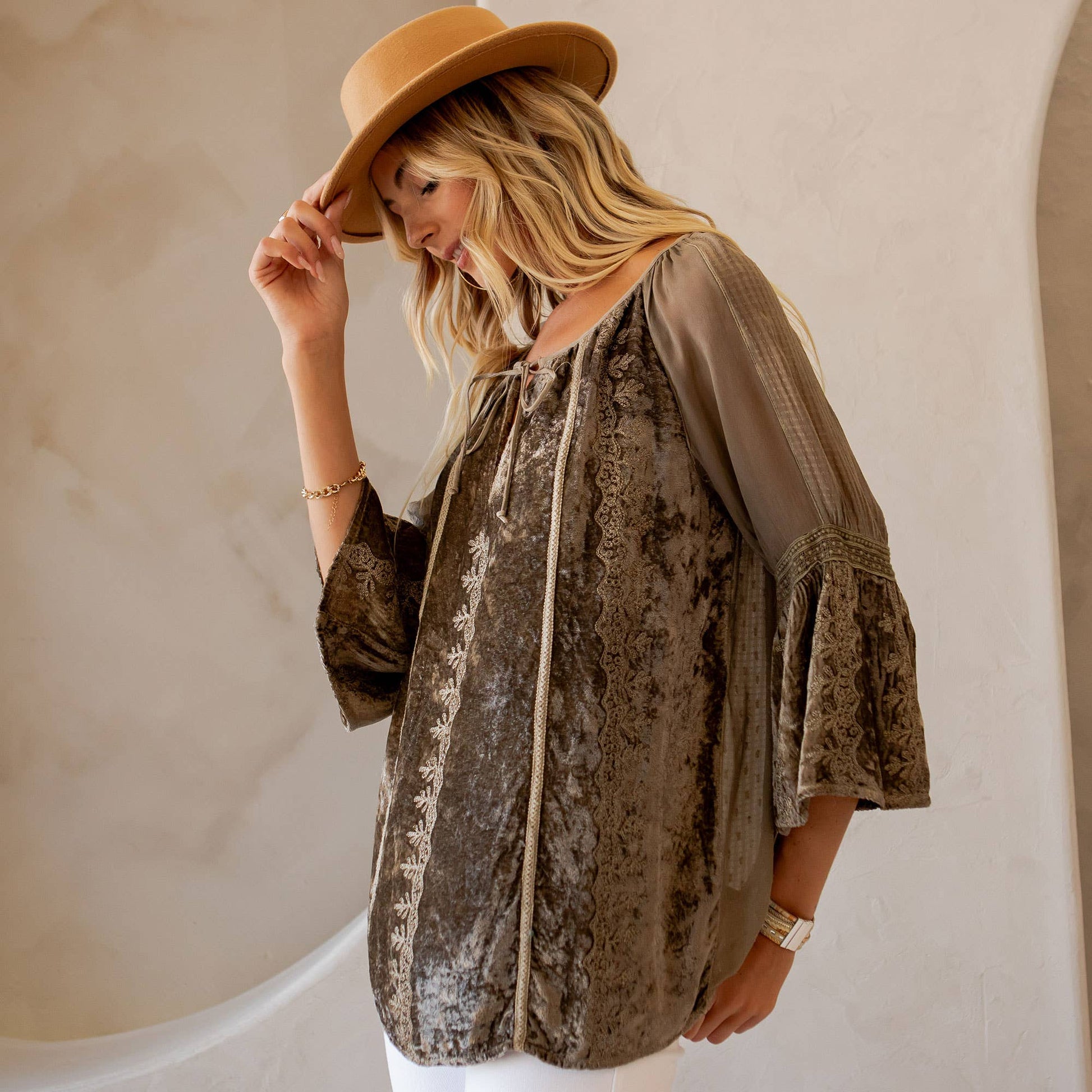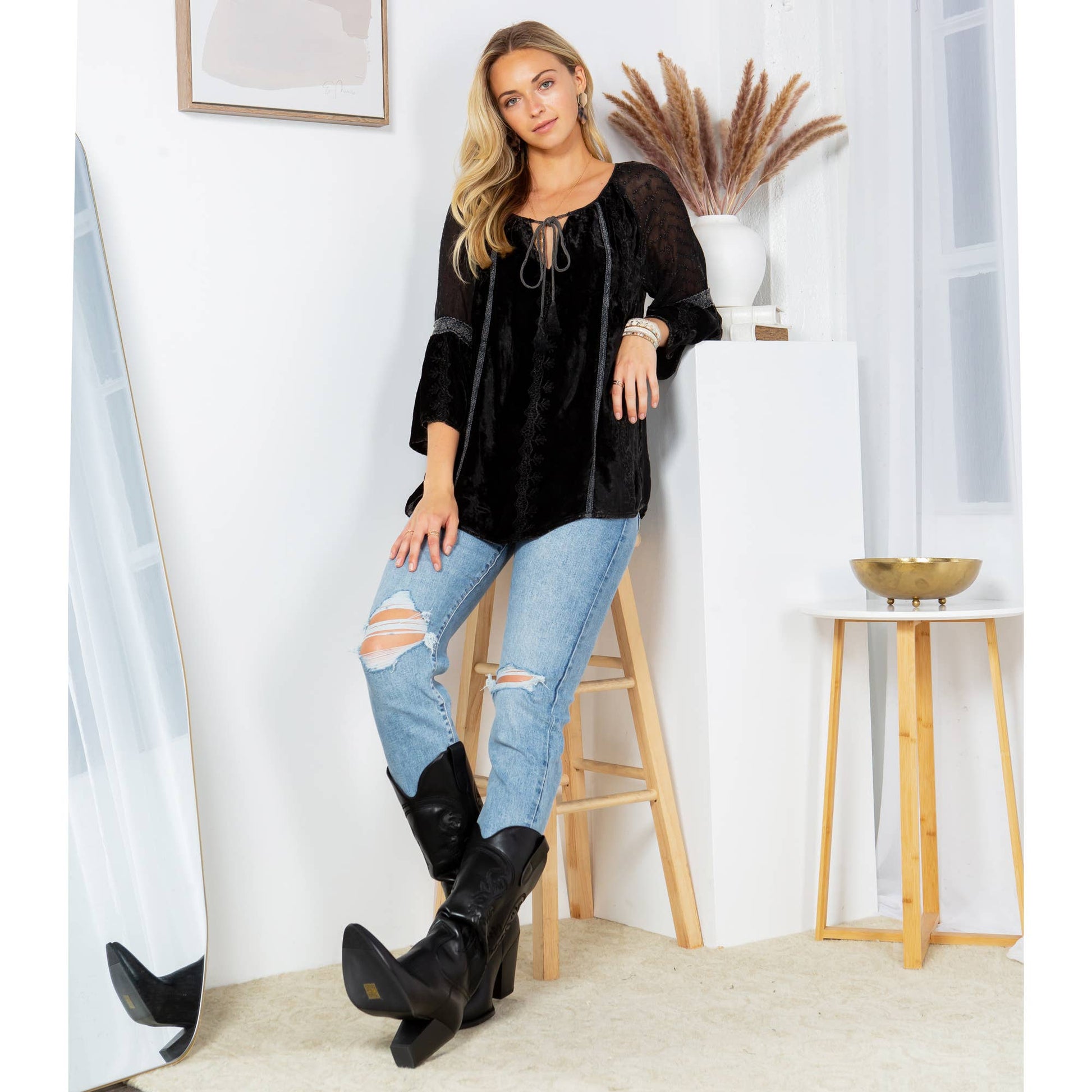 • Peasant-style silhouette offers a flattering and comfortable fit • 3/4 sleeves for a relaxed fit, ideal for layering • Soft velvet fabric ensures comfort and elegance • Versatile piece suitable for both casual and evening wear