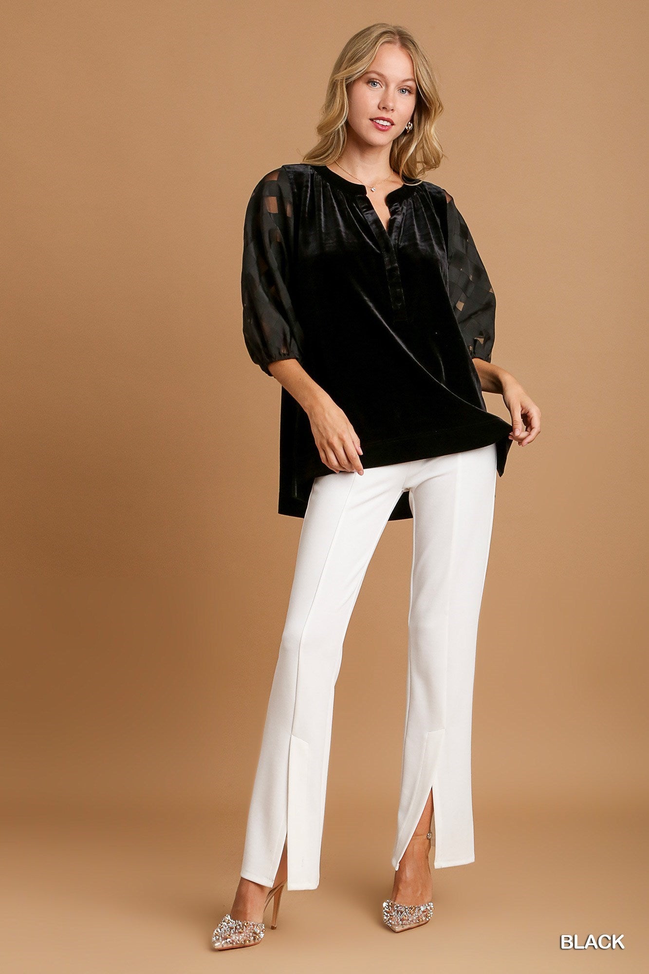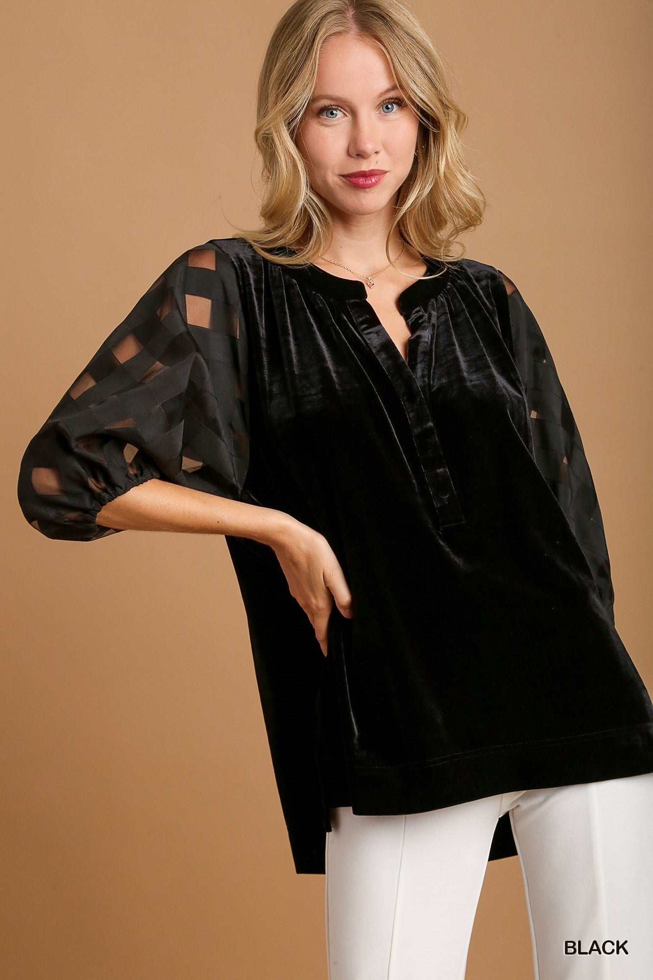 Velvet V-Notched Top with Organza 3/4 Puff Sleeve