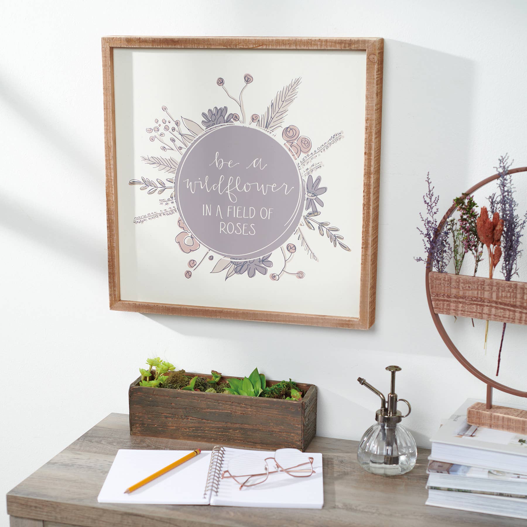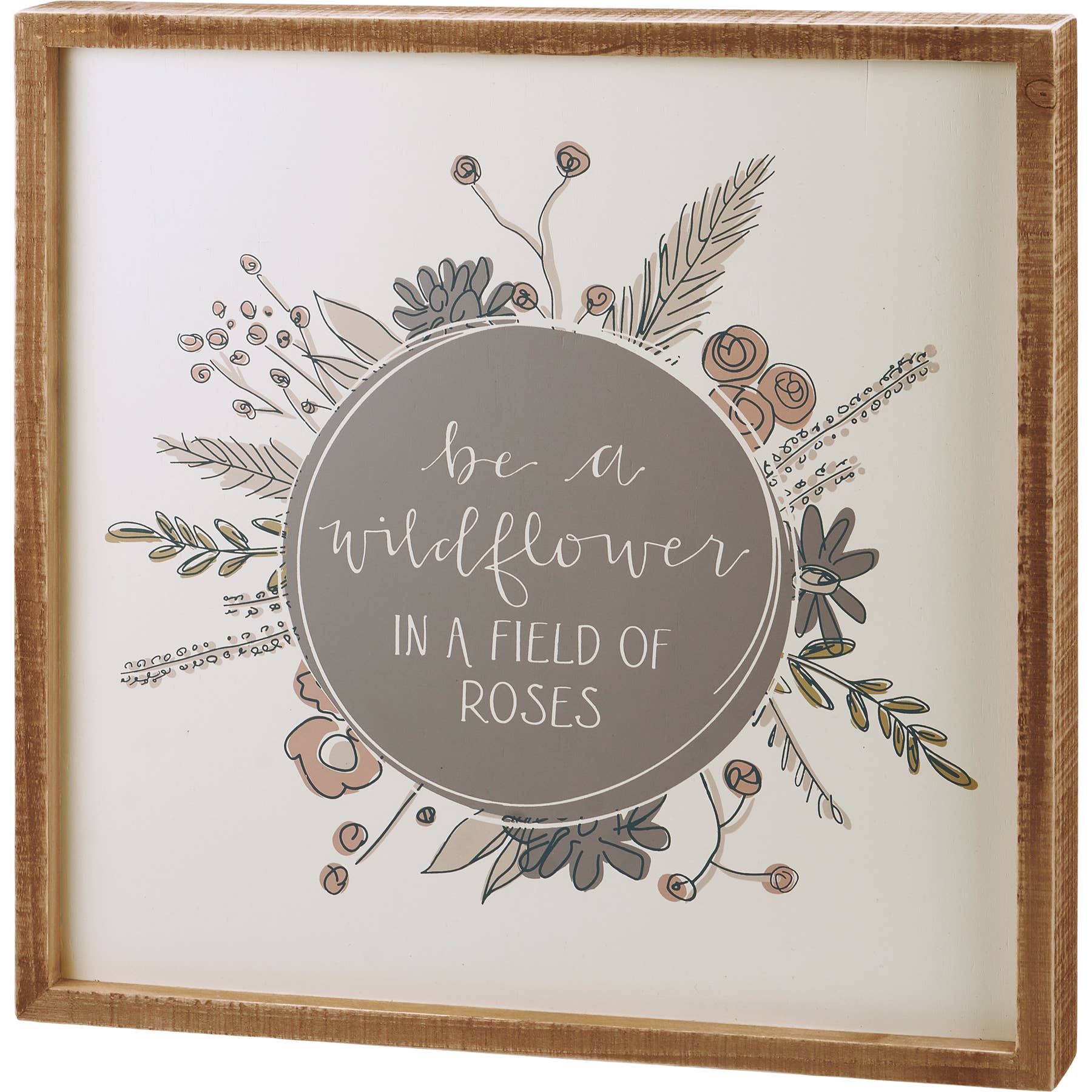 A wooden inset box sign from our Cottagecore Collection displaying hand illustrated design of wildflowers with "Be A Wildflower In A Field Of Roses" sentiment on cream background.