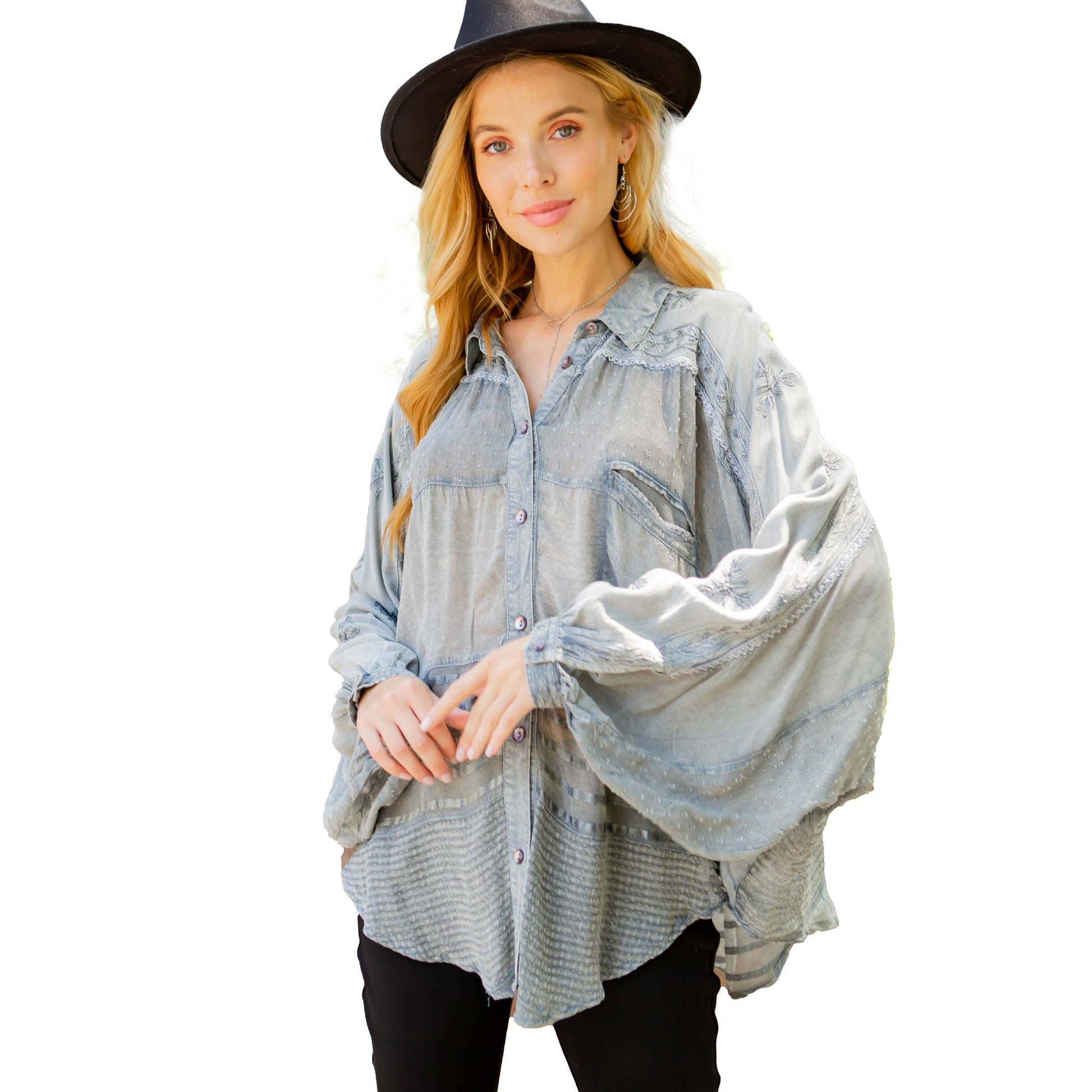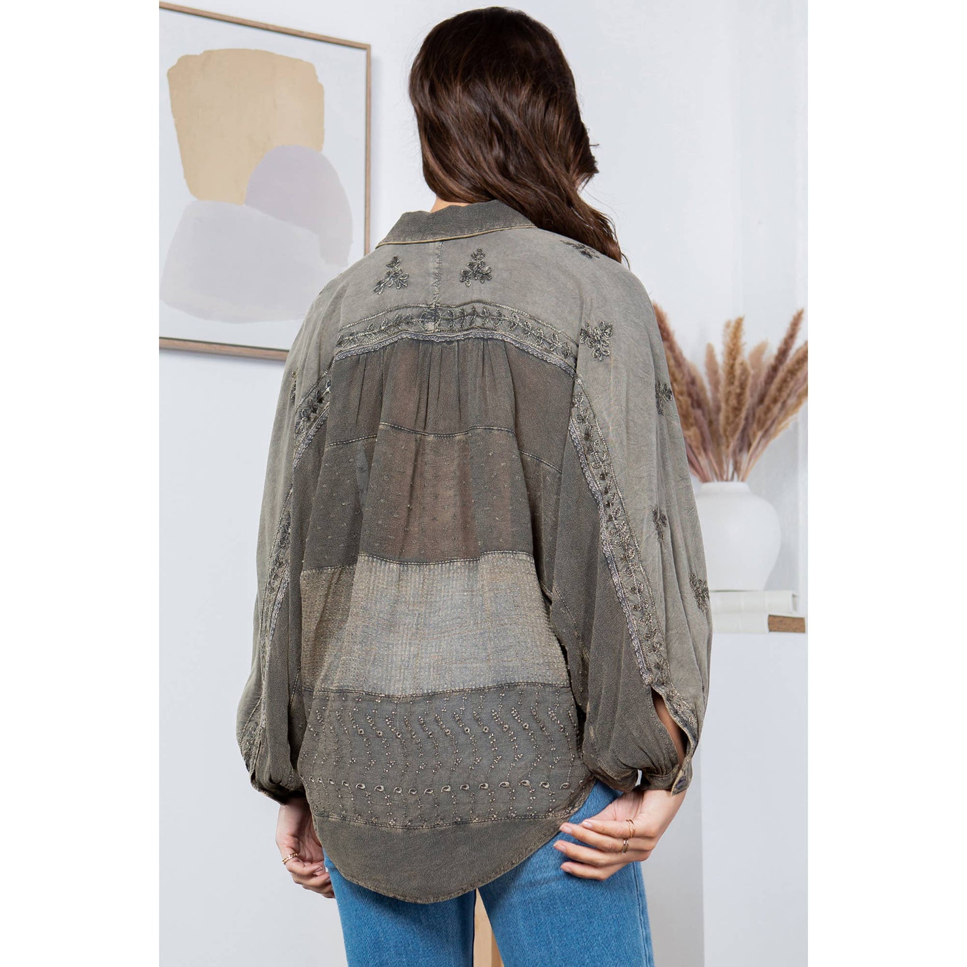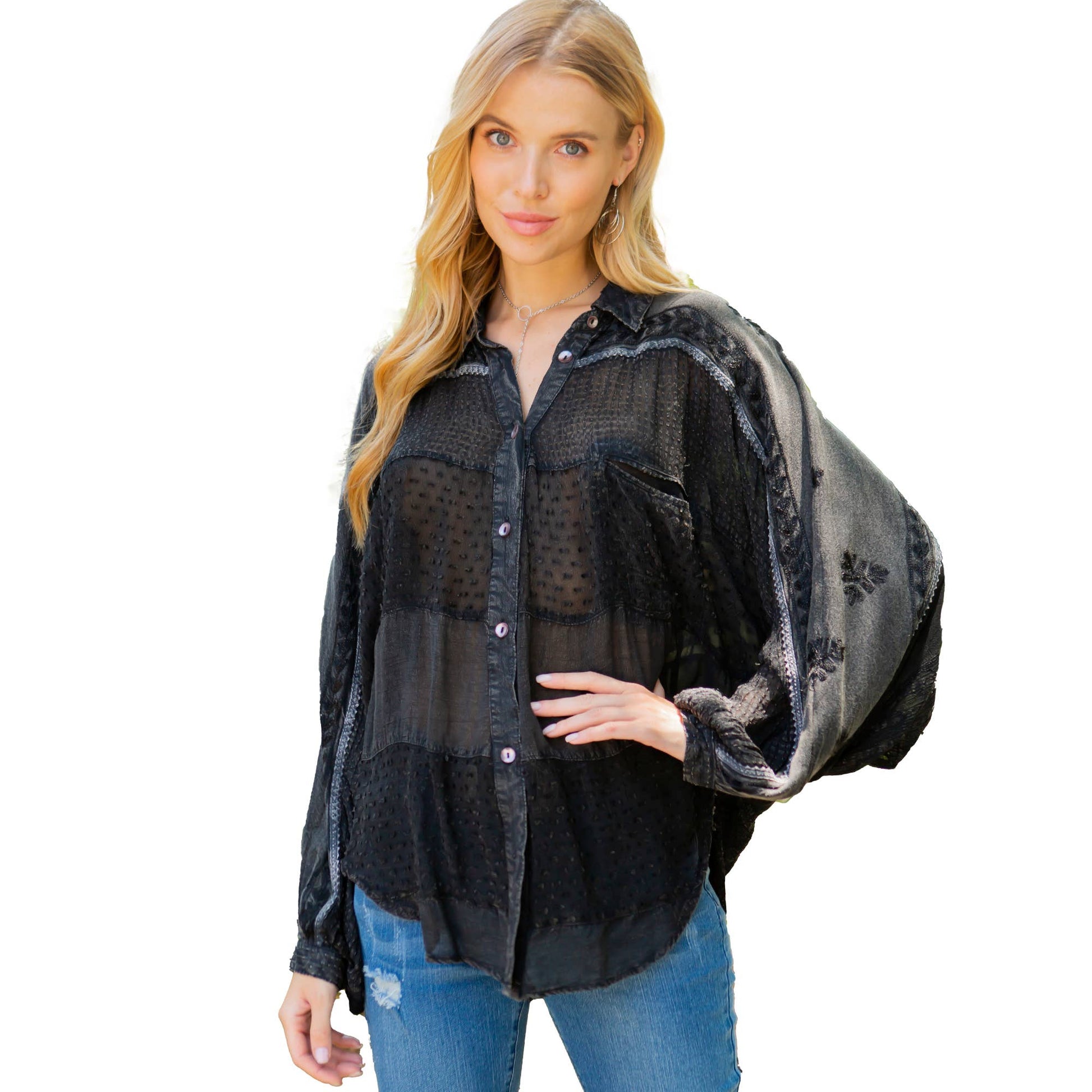 • Dolman-style long sleeve shirt with a buttoned-down construction.