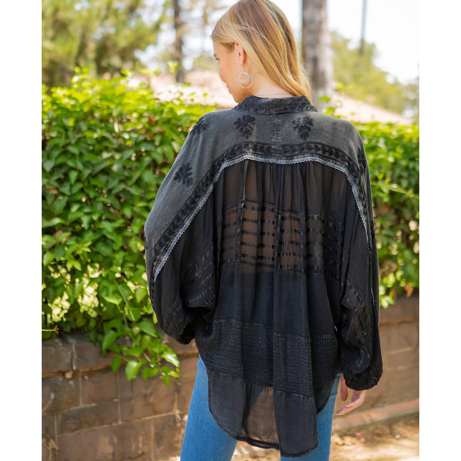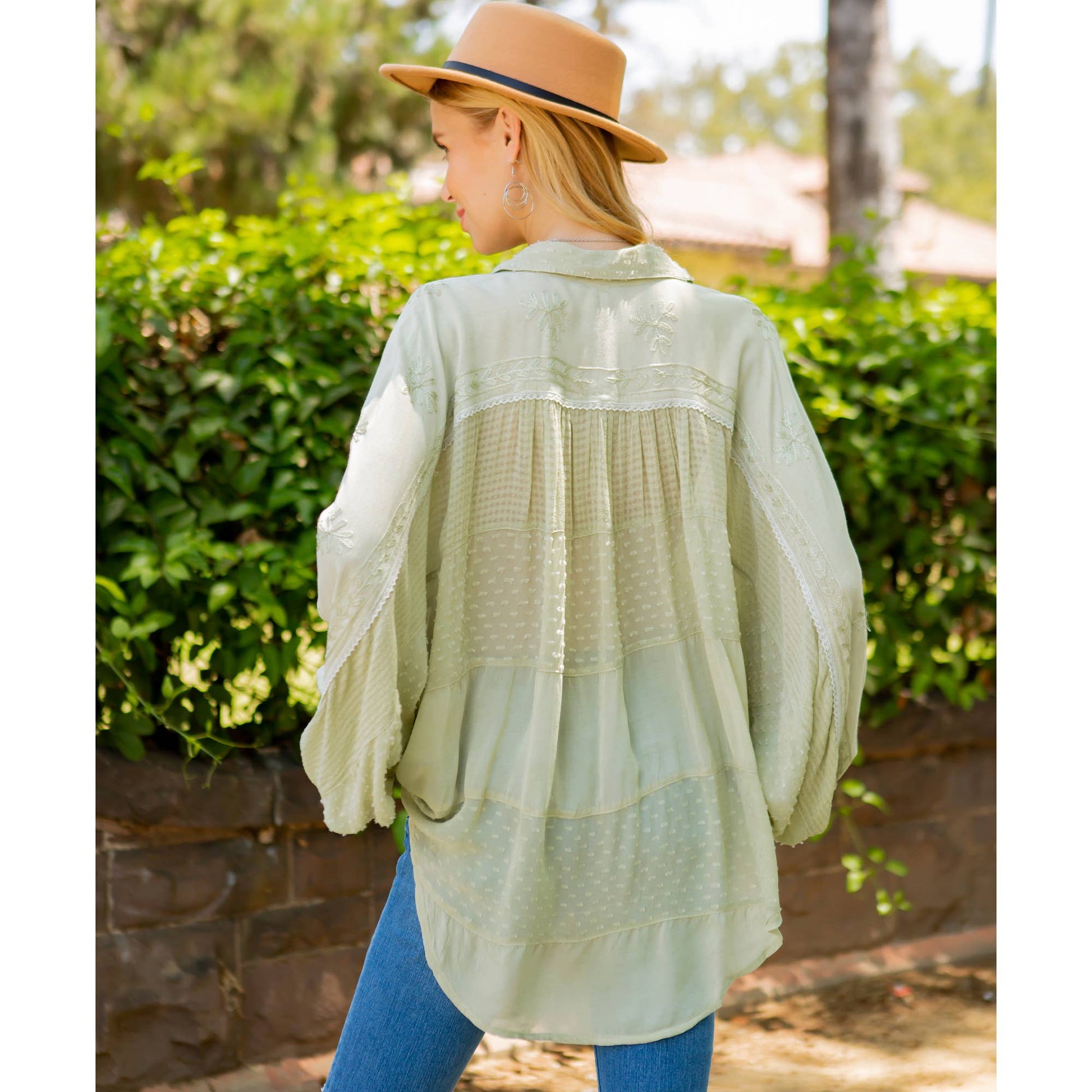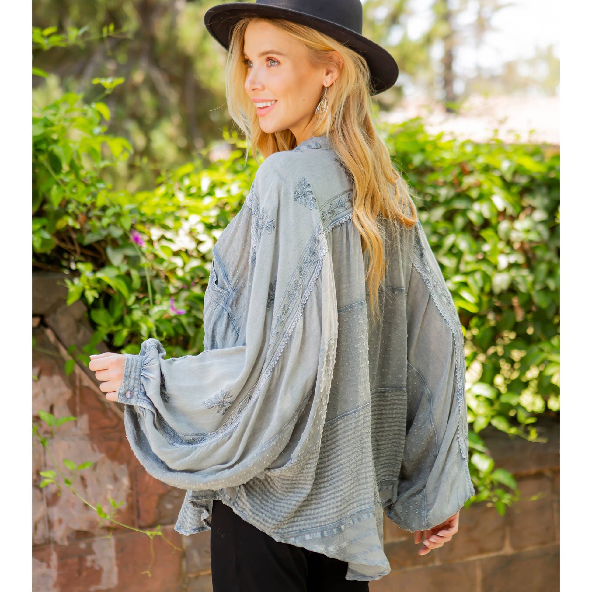 • Dolman-style long sleeve shirt with a buttoned-down construction.